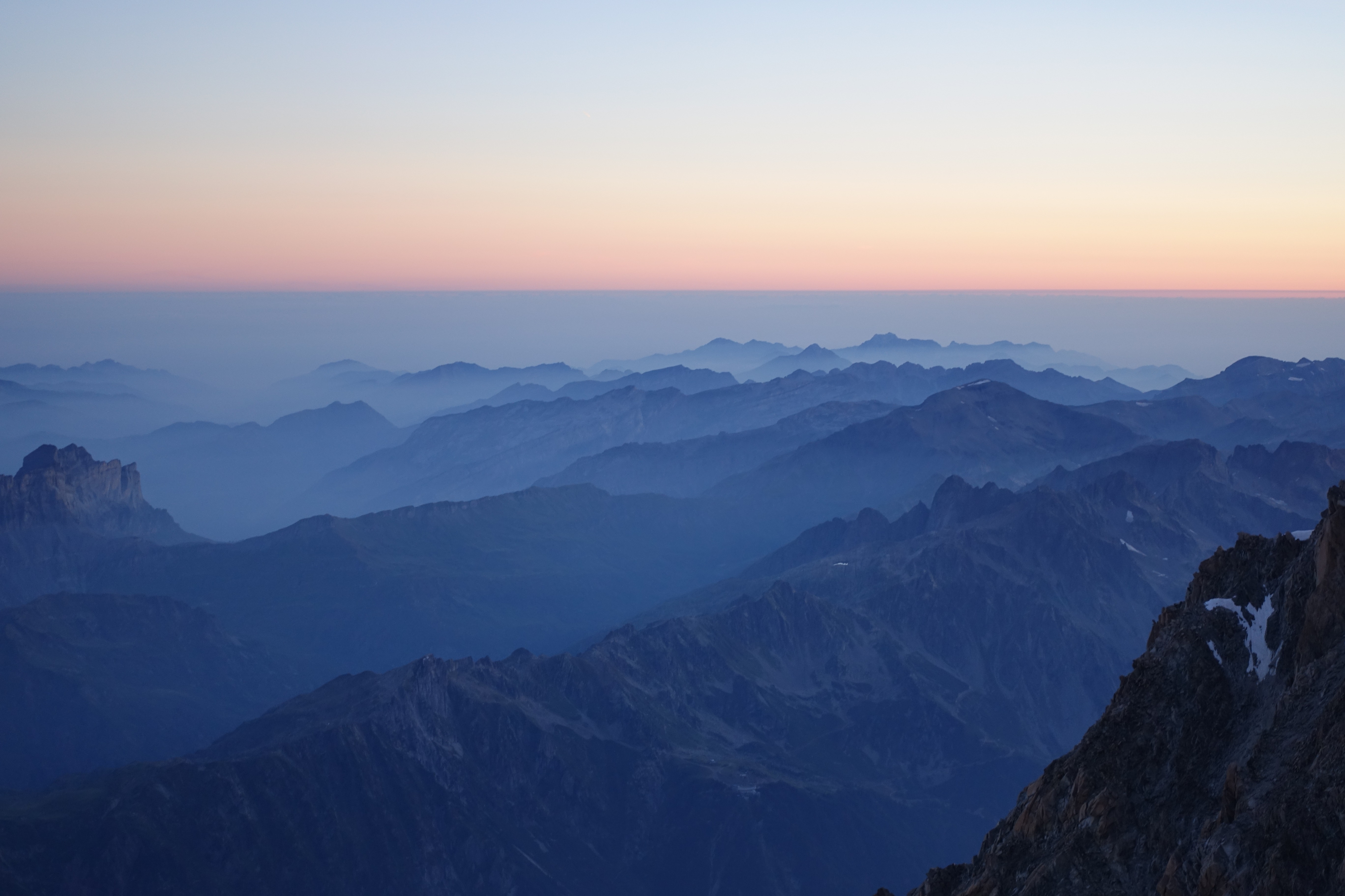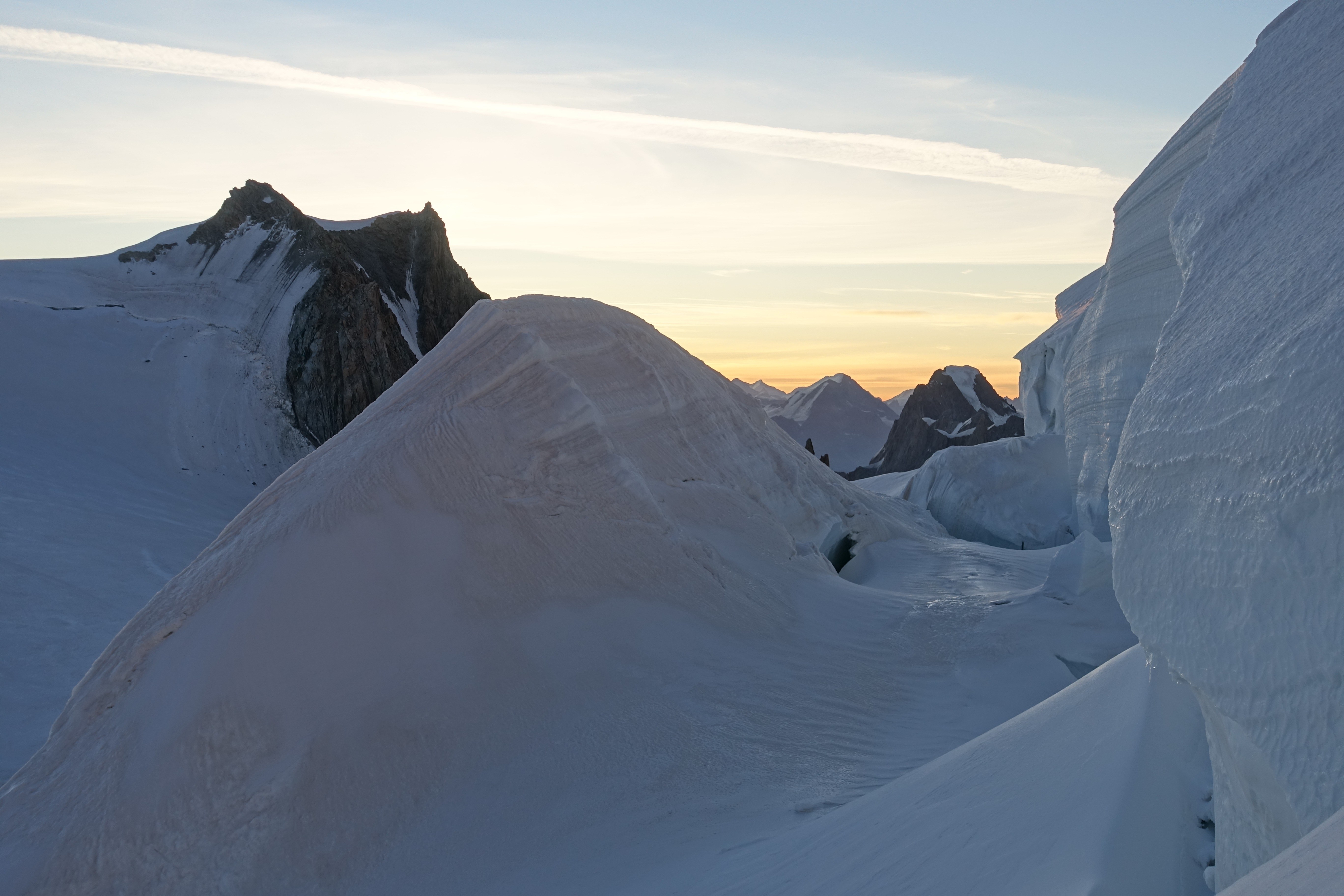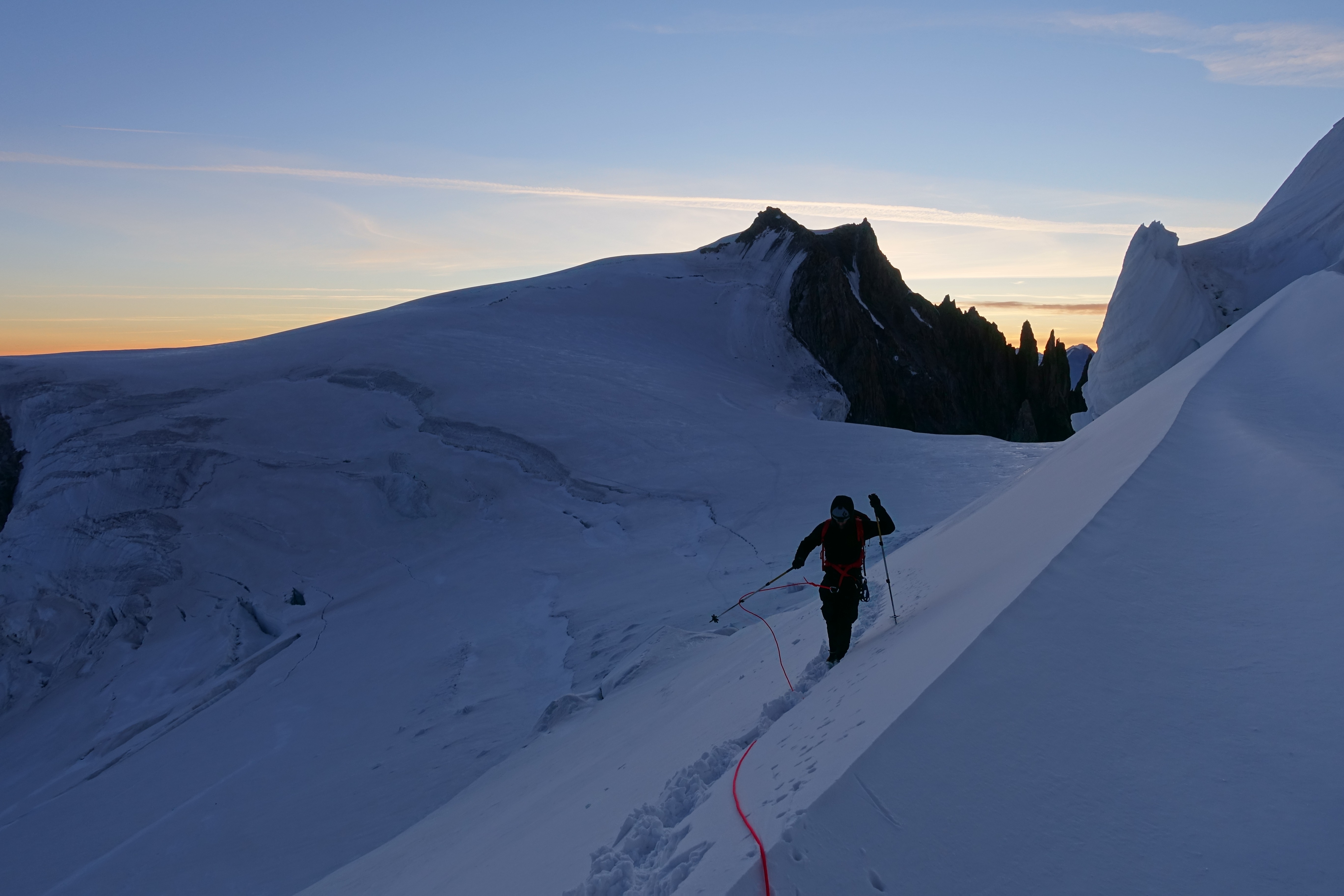 Apartándome un poco de los detalles técnicos, no puedo evitar decir que el amanecer en esta parte delLa subida al Mont Blanc es increíblemente hermosa. Cada vez que estamos aquí, esta vista evoca emociones indescriptibles. Ya lo he visto muchas veces, pero sigue siendo como la primera vez: deleite del alma e intentos de capturar lo inefable en una fotografía.