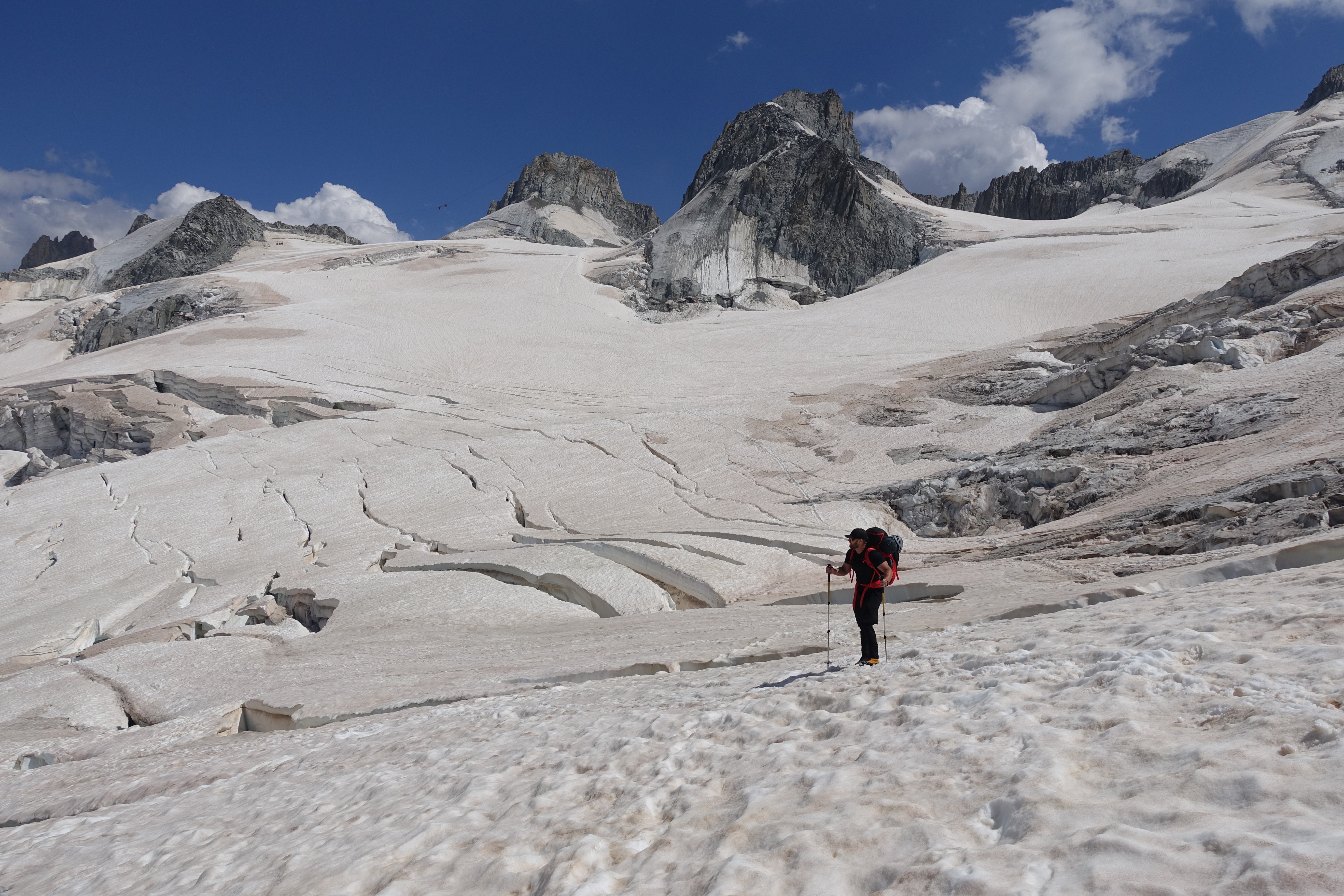 Algunos problemas aparecieron en el tramo más empinado, la salida de la pista hacia el contrafuerte del Mont Maudit, único lugar del recorrido donde es necesario asegurar o utilizar cuerdas fijas. La cuerda fija que cruzaba la ancha pista de montaña estaba profundamente bajo la nieve fresca que el día anterior había caído sobre la pendiente.