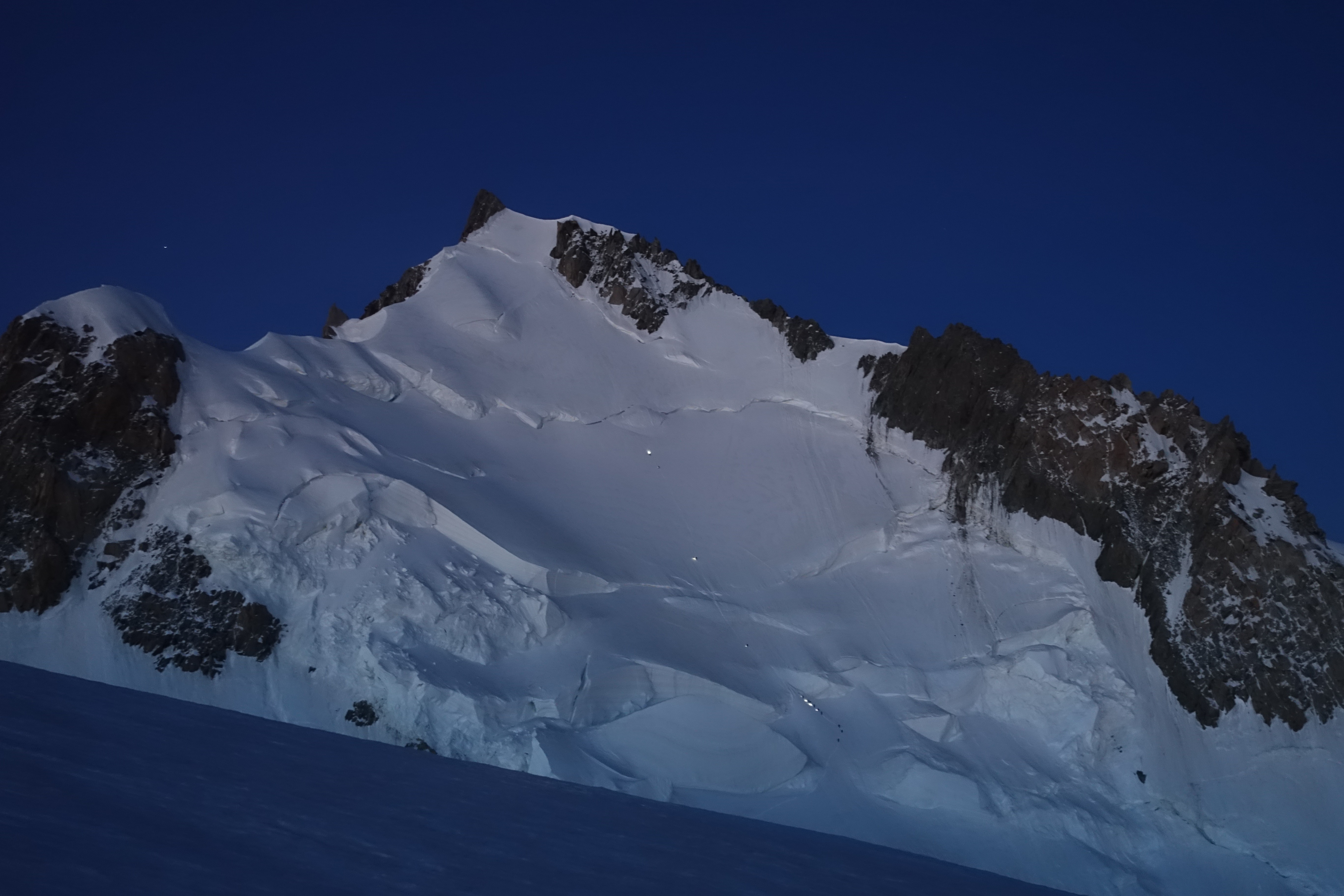 Empezaré por lo que me llamó la atención primero: la ruta por el Mont Maudit, que uso la mayor parte del tiempo para subir al Mont Blanc, suele estar abarrotada en esta época del año. El Cosmic Hut al comienzo del sendero suele estar muy lleno. Cada noche una hilera de farolas se extiende desde el pie de la pista hasta la salida a la meseta del Mont Blanc de Tacul.