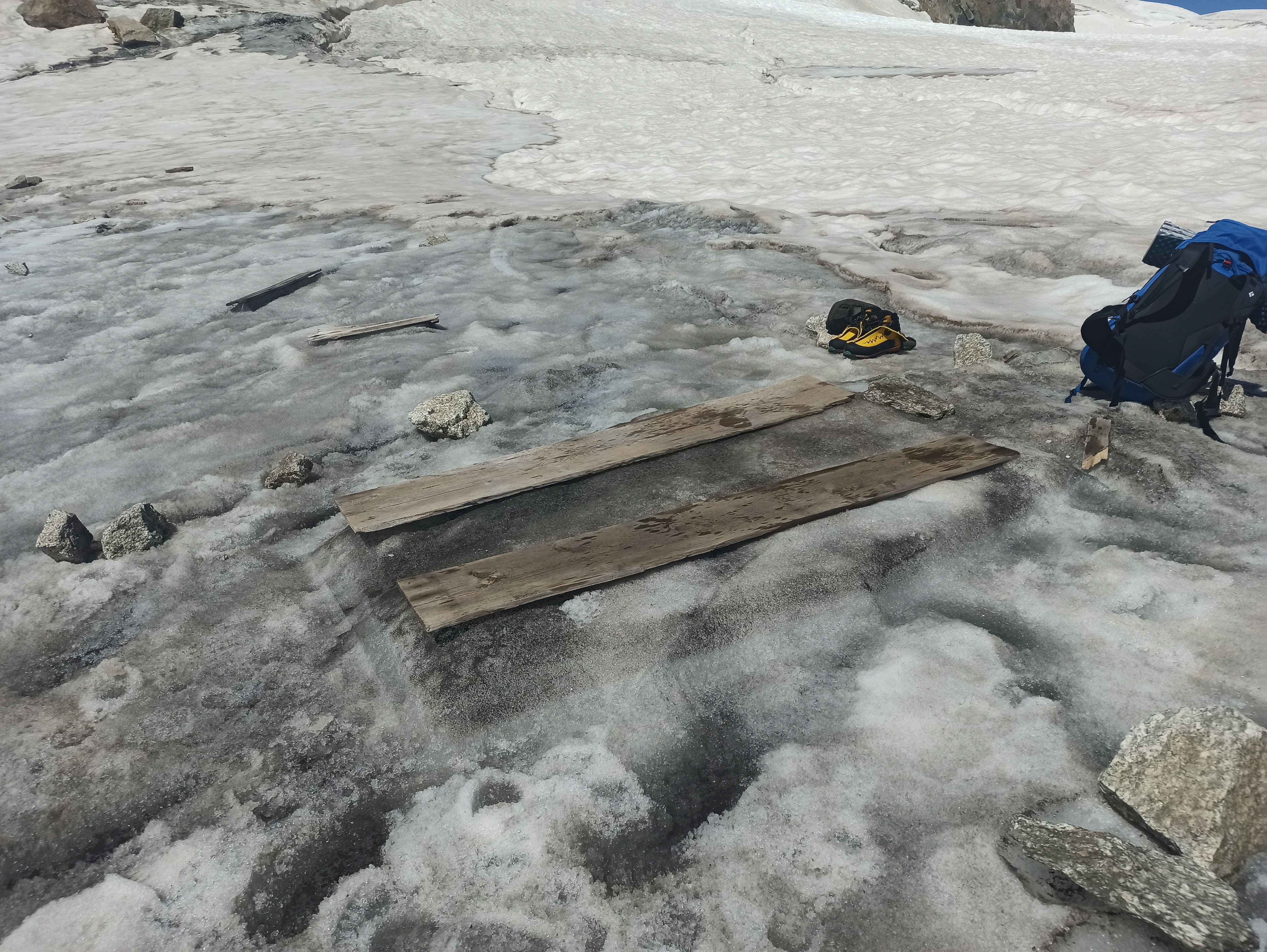 Pero en el descenso todos los aspectos relacionados con el calor cobraron relevancia. La densa nieve, congelada durante la noche, se convirtió en un desastre absoluto después del amanecer, se abrieron los agujeros de numerosas grietas, algunas de las cuales eran trampas muy peligrosas que se expandían hacia abajo. De tal accidente ni una cuerda ni un casco te salvarían.