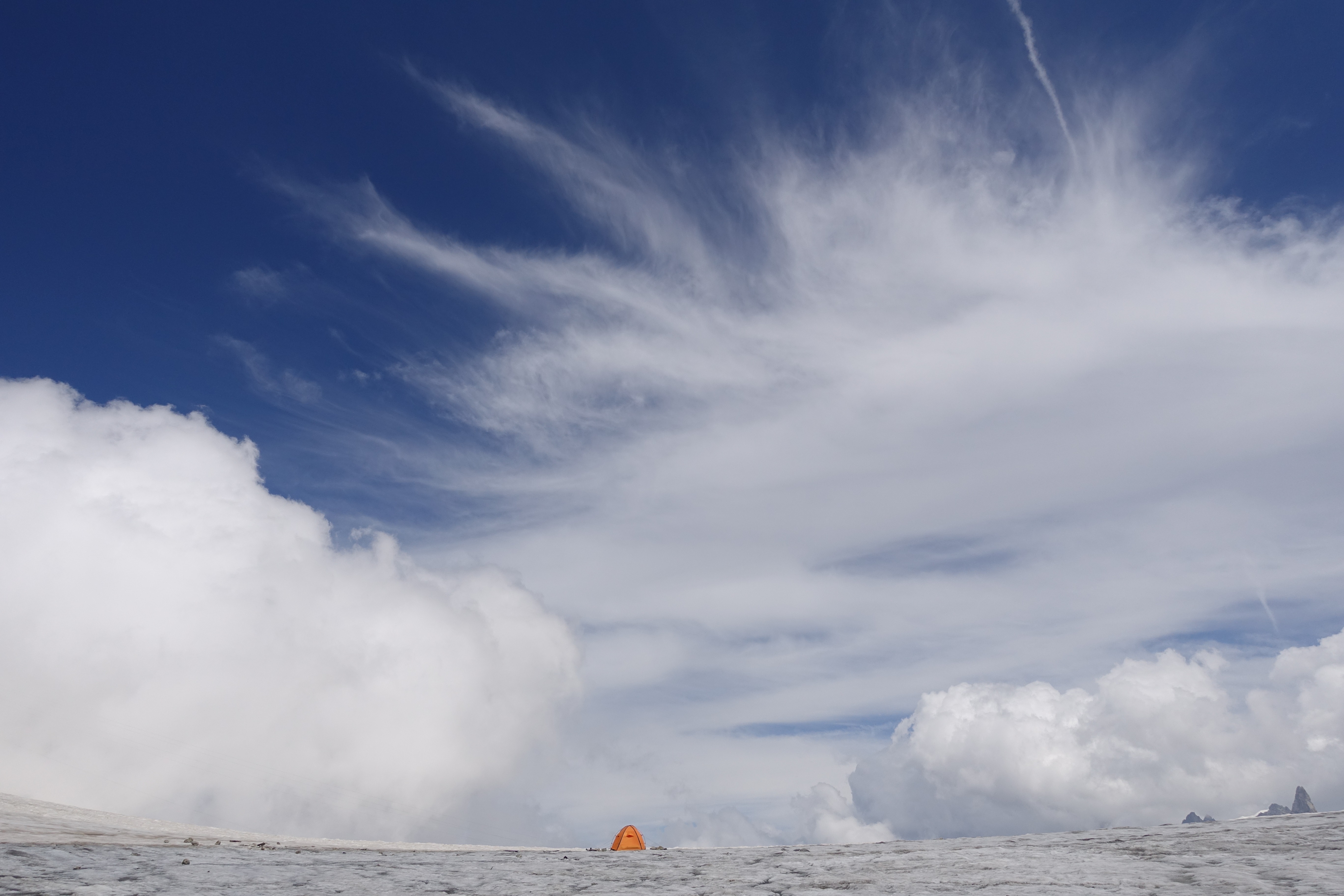 No acertamos con el clima. La noche prevista para la ascensión transcurrió bajo el rugido continuo de una tormenta y ráfagas de viento tormentoso. Nadie se atrevió a salir a la ruta con semejante tiempo. Nosotros tampoco lo intentamos. La previsión meteorológica era favorable al día siguiente, por lo que decidimos esperar un poco. Por la tarde el tiempo mejoró, por la noche el viento amainó por completo y se abrió un cielo despejado y estrellado.