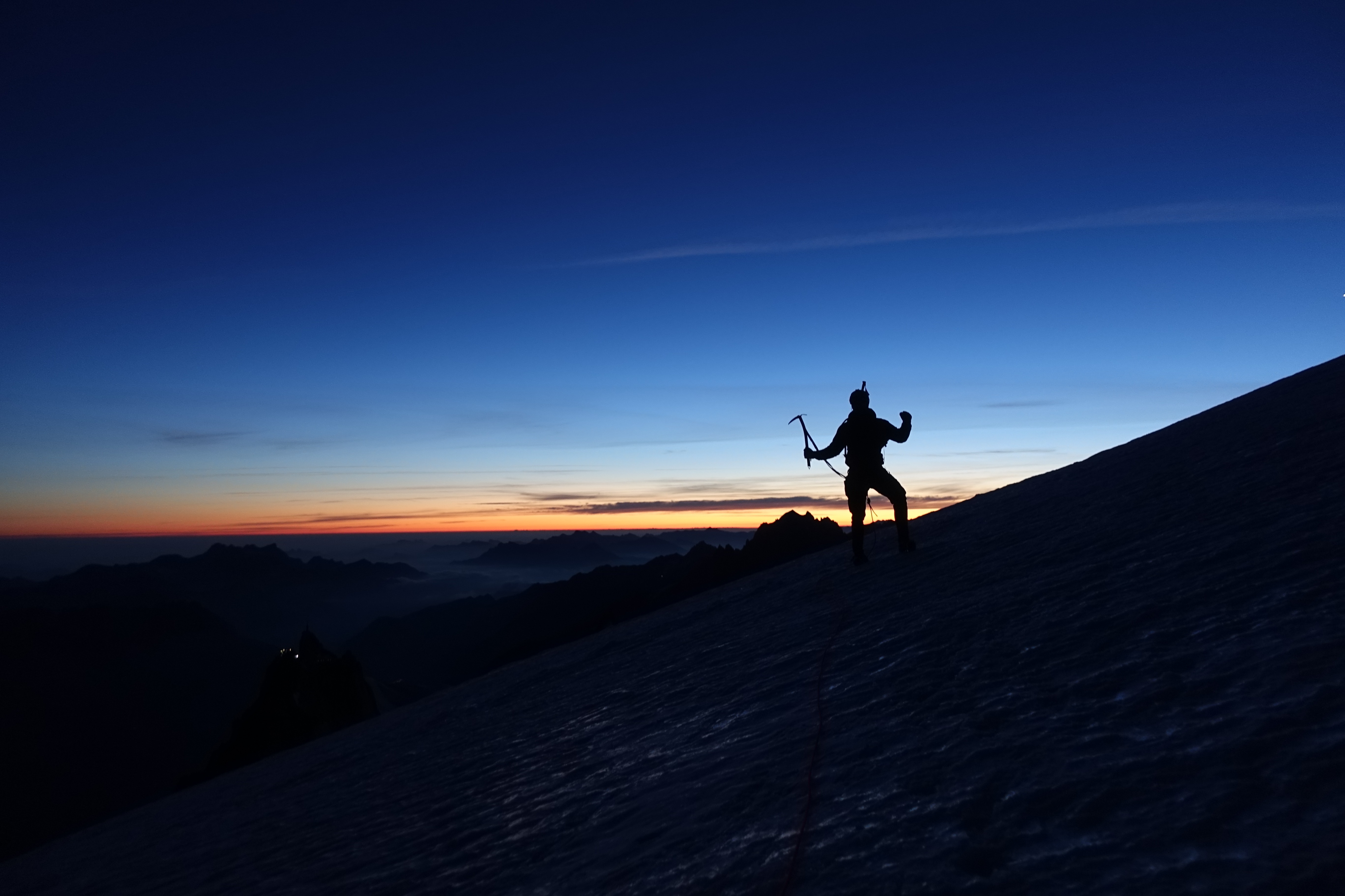 A pesar de las condiciones casi ideales y del día anterior perdido para escalar, no había mucha gente dispuesta a escalar el Mont Blanc en el Cosmic Hut, ni tampoco había colas para la ruta. Nuestro equipo fue el último en salir, a las 3:30, y delante de nosotros solo había 4 grupos de 2-3 personas; para el Mont Blanc durante la temporada alta, era simplemente una ruta vacía.