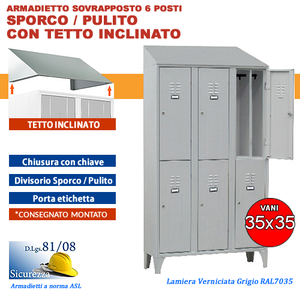L'armadietto spogliatoio in metallo 1 anta è disponibile nella versione smontata e monoblocco grigio RAL 7035 . Per una maggiore igiene è possibile montare il tetto inclinato che riduce la permanenza di polveri potenzialmente dannose . Inoltre, se si utilzza nelle scuole è preferibile venga fissato al muro per una sicurezza ulteriore .