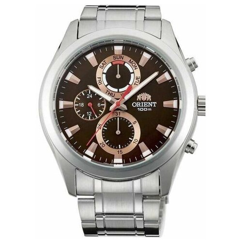 Montre-bracelet japonaise pour homme Orient FUY07002T0. Mouvement à quartz japonais KTA00. Indicateurs de pointeur pour la date et le jour de la semaine. Affichage de l'heure dans un deuxième fuseau horaire. Couverture arrière vissée.