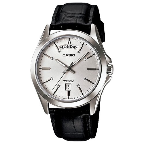Montre-bracelet japonaise pour homme Casio Collection MTP-1370L-7A. Mouvement à quartz d'une grande précision +/- 20 secondes par mois. Les aiguilles et les index sont recouverts d'un revêtement luminescent sûr qui brille dans le noir. Affichage de l'heure au format 12 heures. Aiguille centrale des secondes. Affichage de la date et du jour de la semaine. Le verre minéral durable et résistant aux rayures protégera votre montre des dommages. Résistance à l'eau 50WR (5 bars). Sans enlever votre montre, vous pouvez prendre une douche ou un bain. Le boîtier de la montre résistant aux chocs est en acier inoxydable doté de propriétés anticorrosion élevées. Un bracelet en cuir véritable de haute qualité est élégant, confortable et pratique. La durée de vie d'une batterie peut aller jusqu'à 3 ans. Les montres-bracelets japonaises pour hommes de la collection Casio sont un accessoire élégant qui complétera votre look au quotidien.Grâce à son design laconique, la montre Casio MTP-1370L-7A est idéale pour une utilisation avec n'importe quel look ; elle s'adapte parfaitement à la main, n'attire pas trop l'attention et donne à l'utilisateur élégance et dignité à l'apparence. Le bracelet élégant a une largeur standard, peut être facilement détaché et s'adapte parfaitement au grand cadran léger. Le corps se caractérise par une résistance et une stabilité élevées. À l'intérieur du Casio MTP-1370L-7A se trouve le dernier mouvement à quartz développé par Casio.