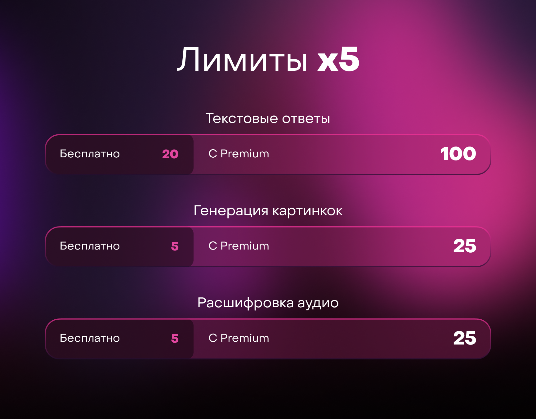 Все лимиты бота с Premium-подпиской увеличиваются в 5 раз. Таким образом, вы сможете получать до 100 текстовых ответов в день, генерировать до 25 изображений и расшифровывать до 25 аудиофайлов. Если же и этого окажется мало, то совсем скоро вы сможете докупить дополнительные ответы — они появятся уже в следующем обновлении.