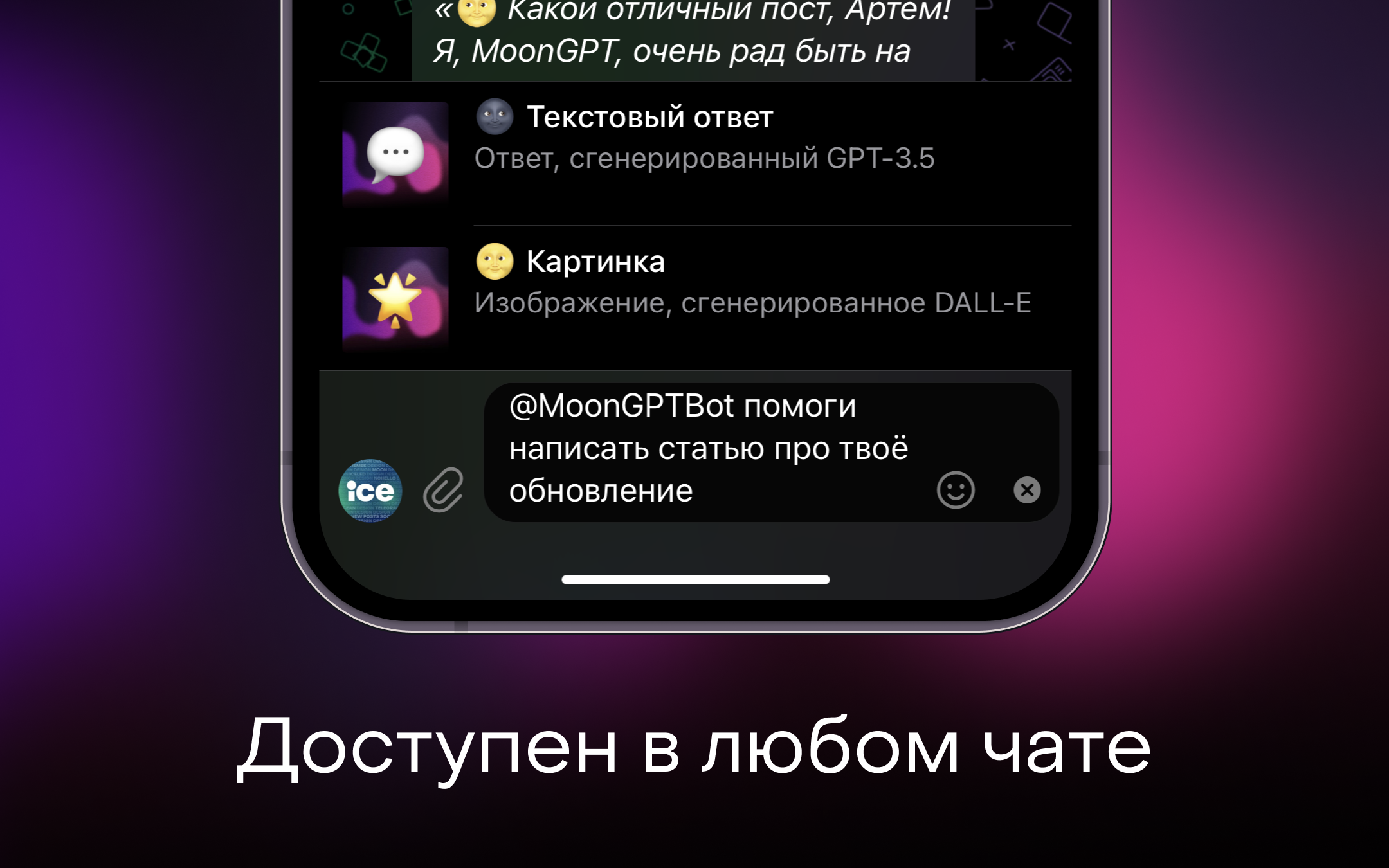 Inline-режим прекрасно подойдёт не только для текстового общения, но и для генерации картинок. Кстати, за неё в MoonGPT отвечает технология DALL-E.