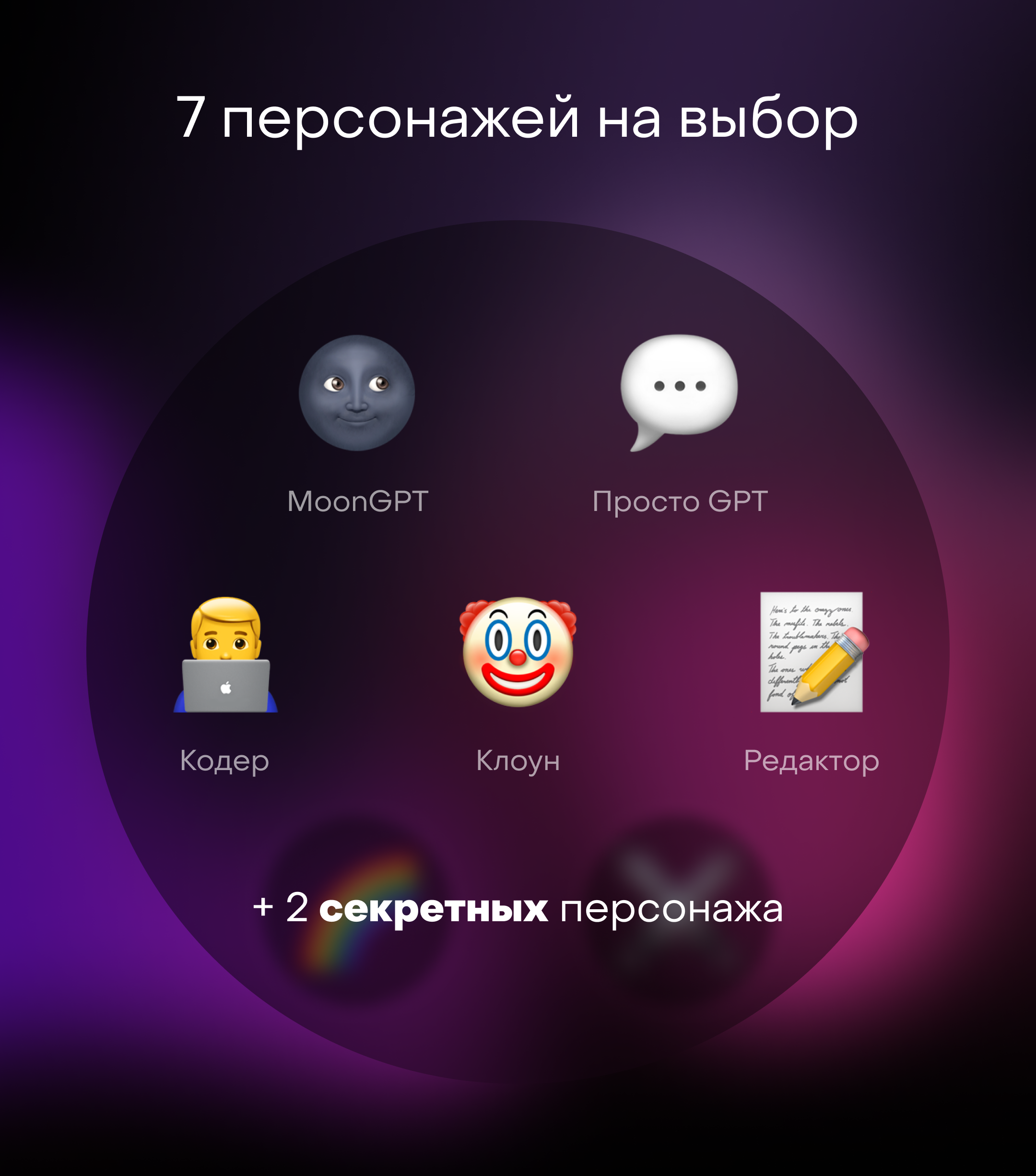 Самая весёлая функция Premium-подписки! Теперь бот может отвечать не только от лица MoonGPT, но и стать стандартным GPT, а также клоуном, редактором, кодером, и ещё двумя секретными, но очень интересными персонажами.