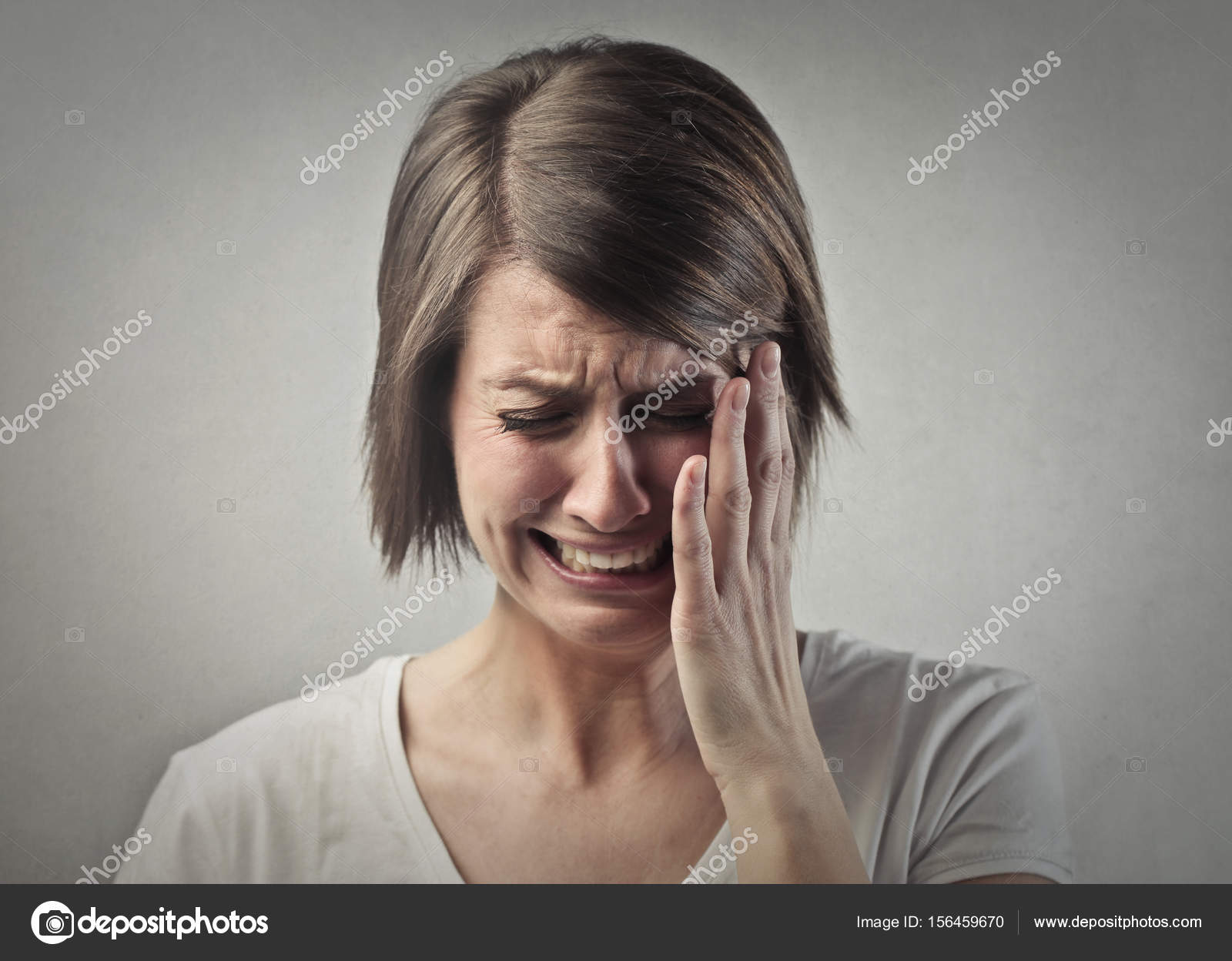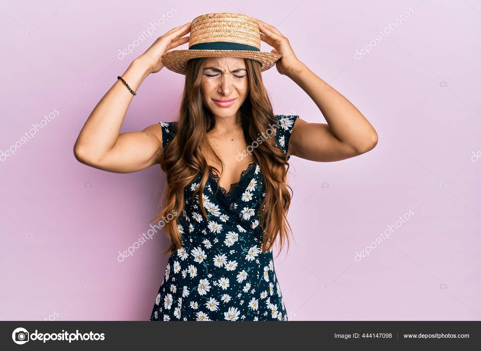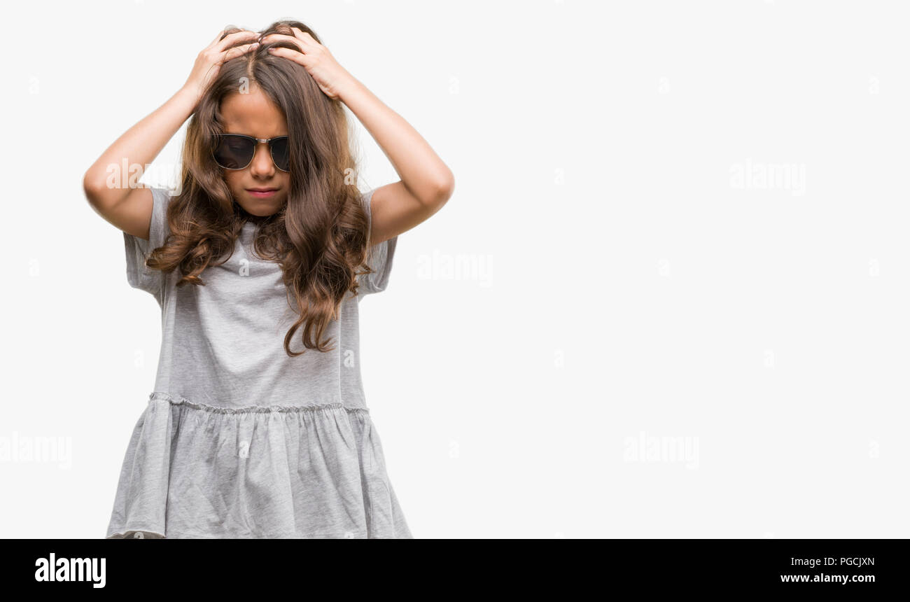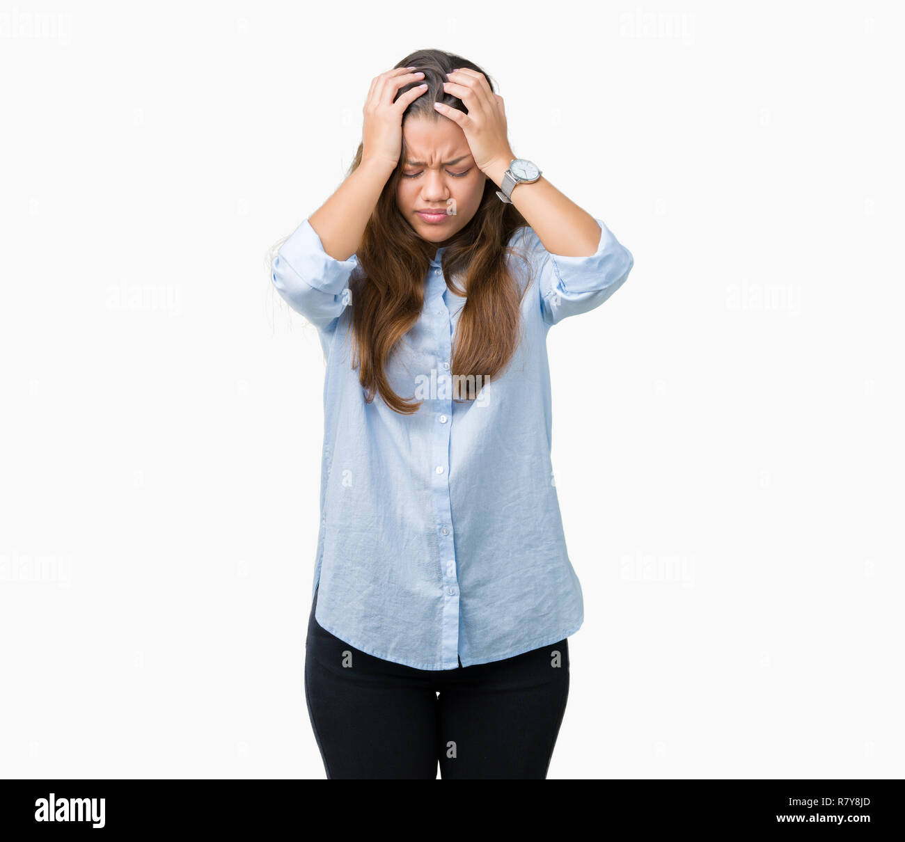Foto sobre Linda mulher morena vestindo uniforme de parto sofrendo de dor de cabeça desesperada e estressada porque dor e enxaqueca . mãos na cabeça . Imagem de menina, desesperado, doente - 219649884