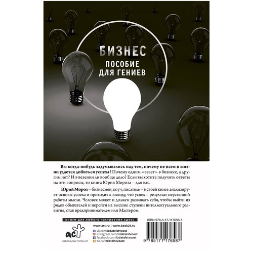 Hayatta neden herkesin başarılı olmadığını hiç merak ettiniz mi? Neden bazı insanlar iş hayatında şanslıyken diğerleri değil? Ve her şey gerçekten şansla mı alakalı? Yuri Moroz - işadamı, antrenör, yazar - kitabında başarının temellerini analiz ediyor ve başarının yorulmak bilmeyen düşünce çalışmasının sonucu olduğu sonucuna varıyor. Bir kişi, sıradan insanların saflarından çıkıp entelektüel gelişimin en üst seviyelerine geçmek, girişimci veya Usta olmak için kendini geliştirebilir ve geliştirmelidir.