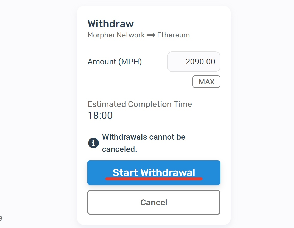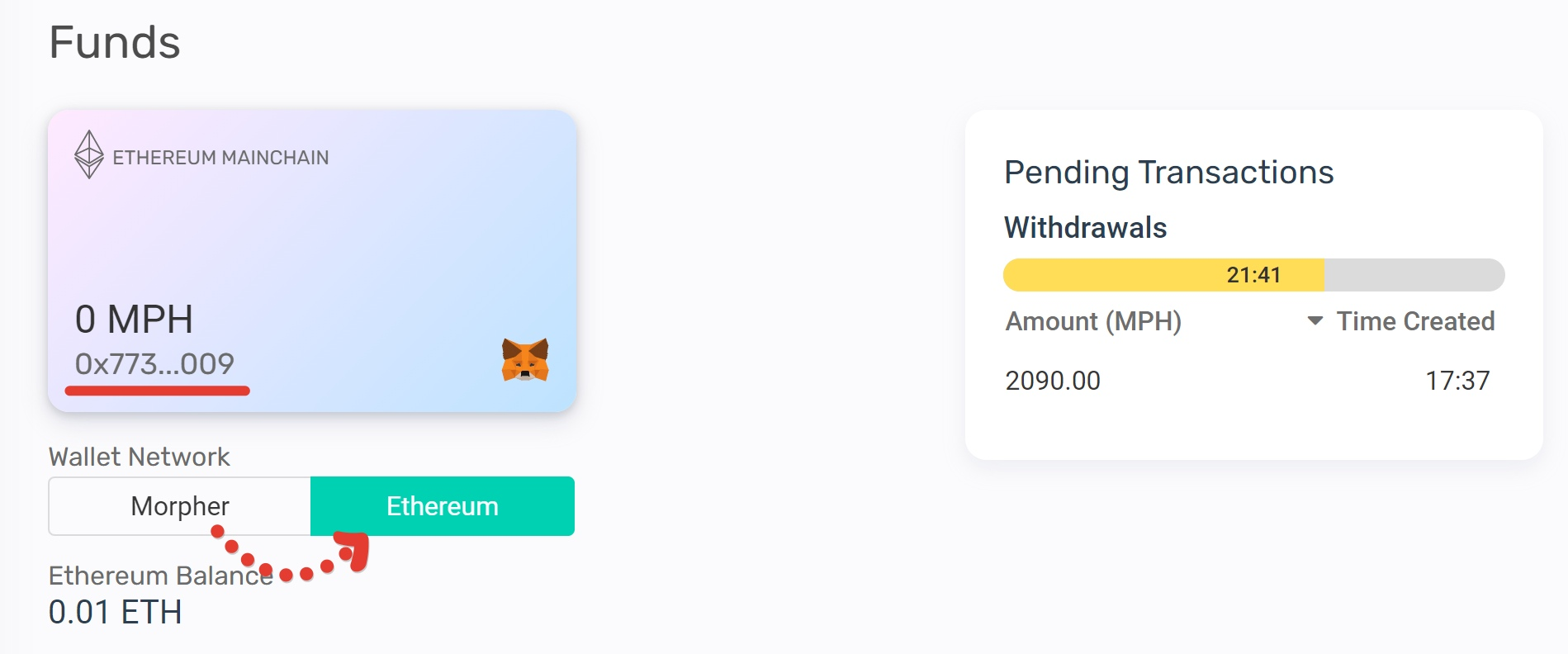 5) Теперь ждем пока закончится таймер и наши MPH переведутся с се ти Morpher на кошелек в сети Etherium