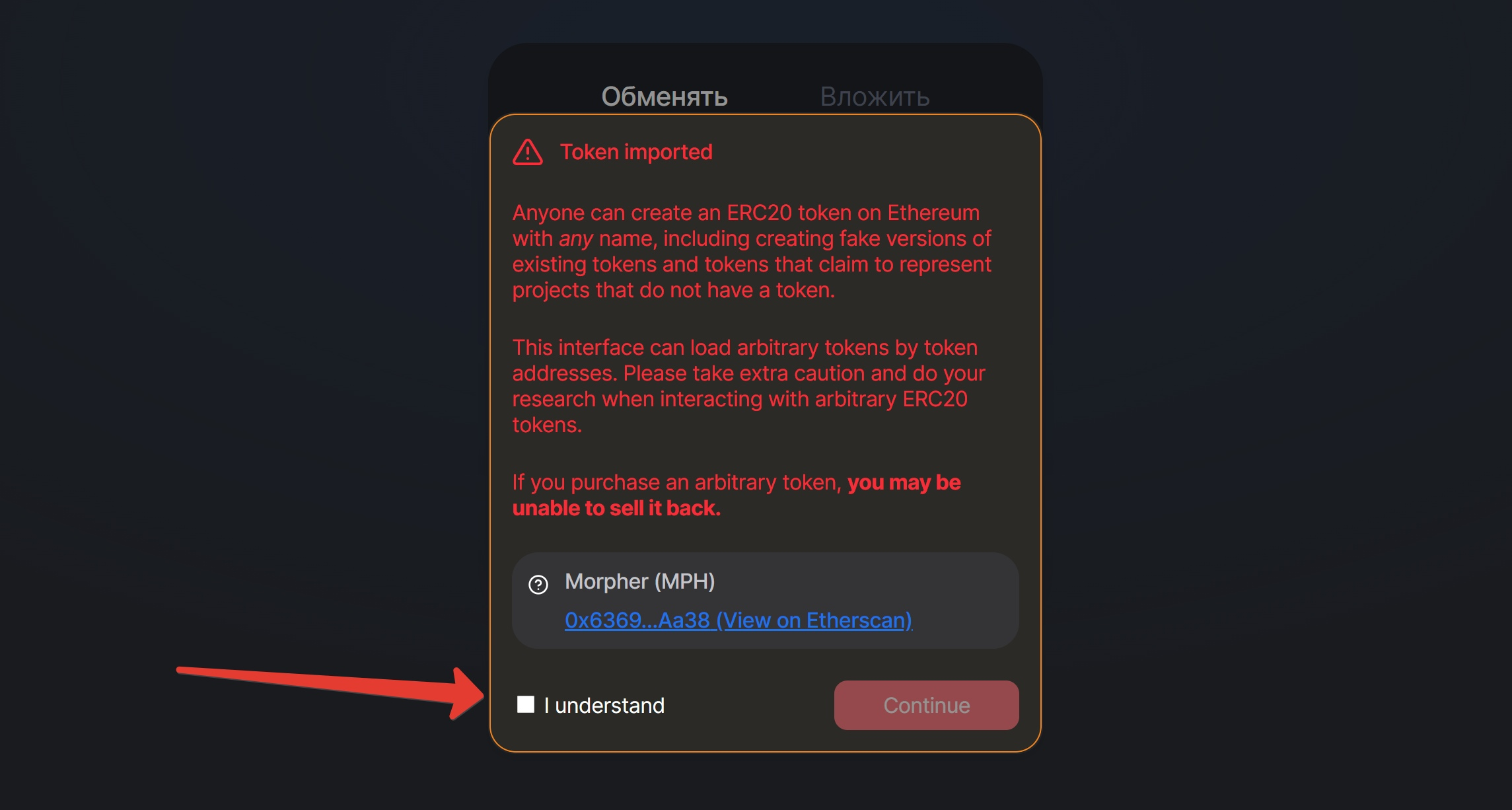 10) Теперь вписываем кол-во MPH которое хотите продать и снизу нам напишут сумму в ETH, которую получим. Если все устраивает, то жмем обмен и подтверждаем транзакцию в MetaMask (Спишет с ETH баланса еще раз комиссию как при выводе MPH с сети морфер на ETH)