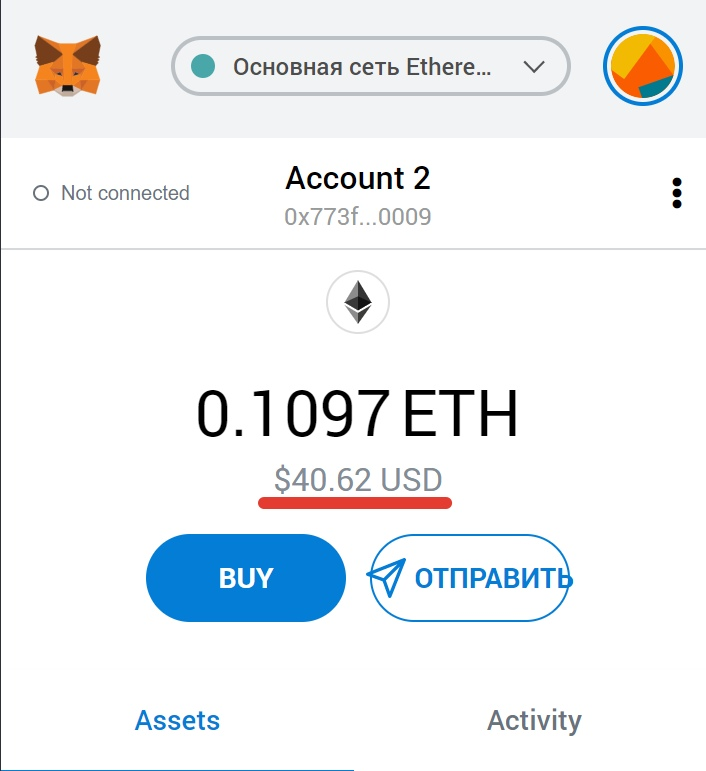 Ждем на иконку человечка и видим наш ETH баланс, который мы получили с проданных MPH. Далее переводим ETH куда пожелаете!