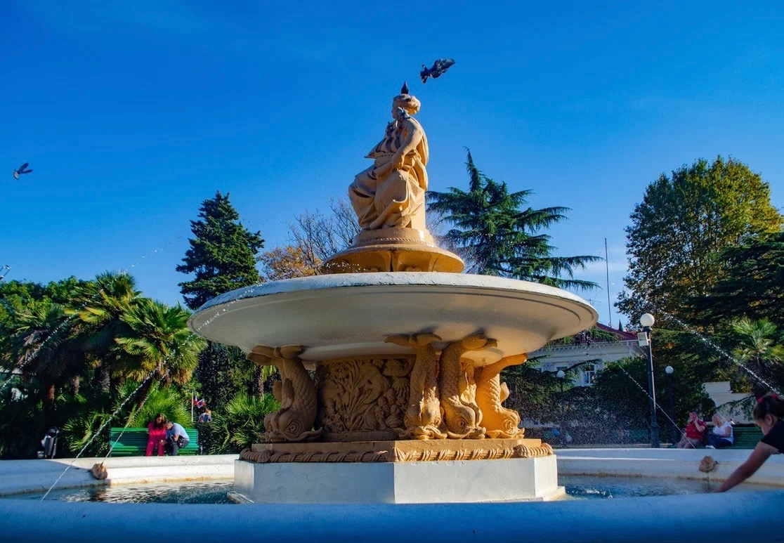 Всю композицию вокзального комплекса завершает сквер через дорогу с пальмами и благоухающими розами. Навигация в лице богини в 7-метровой чаше фонтана с лоцией и кораблем в одной руке, жестом другой успокаивает море, как бы желая мореплавателям спокойного плавания.