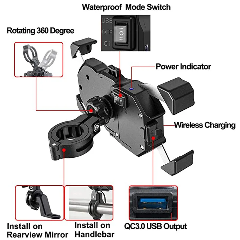 «Motorcycle Phone Holder Fast Charging Bracket 15W Wireless Charger USB QC3.0 Bike Smartphone Stand 360 Mobile Cellphone Support» по лучшей цене на рынке! Всего за 14$ (1330рублей)