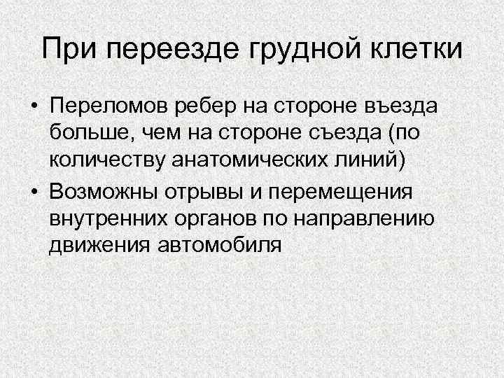 Воздействия на ребра человека подразделяются на непрямые и прямые. При непрямом воздействии сдавливается грудная клетка, поэтому ребра ломаются по обе стороны от места сжатия. Как правило, ломается сразу несколько ребер. В случае прямого воздействия обломки ребра могут повредить различные внутренние органы, легкое, когда ребра прогибаются внутрь.