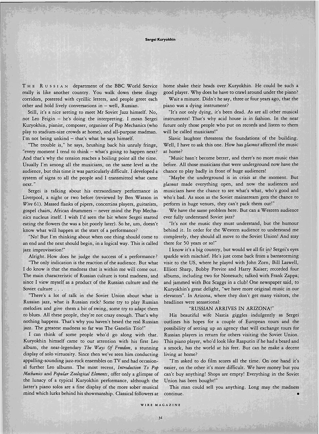 (Перевод материала "Sergey Kuryokhin. Mr Jazz Russia meets Mike Fish" журнала The Wire 1989 года специально для телеграм-канала "Между The Rolling Stones и Достоевским")