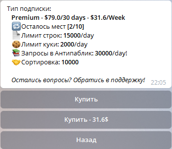 Подписка Private - приобретается только через поддержку, в ней доступна отдельная база в которую загружаются строки и при их получении удаляются, гарантия получения в 1 руки. Так же приватной подписке доступна общая база и всё, что доступно в остальных подписках. Стоимость: 100$ - Неделя || 300$ - Месяц