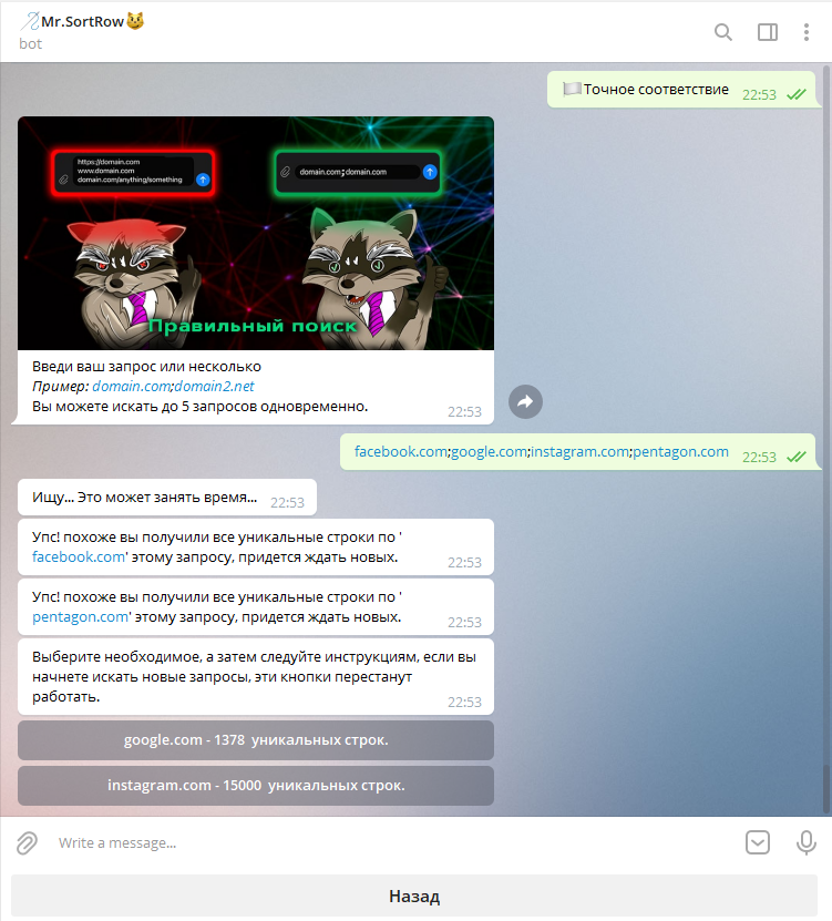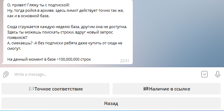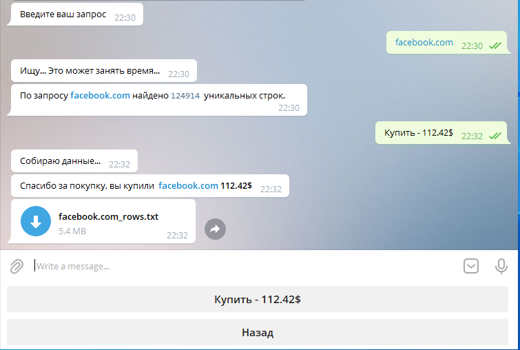 А уники? Ни для кого не секрет, что мы получаем данные с логов, которые могли попасть в руки кому угодно, ведь траферов сейчас уйма и поставщики не всегда честно отдают уникальный материал, но это не так важно, ведь в основном наш бот используется для приватных запросов, но есть и пользователи зарабатывающие на паблик запросах.