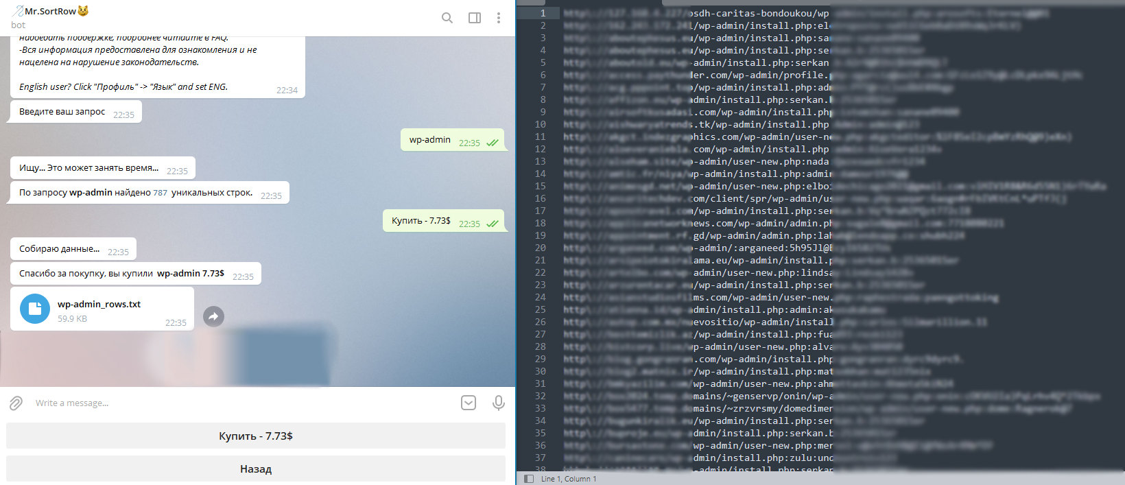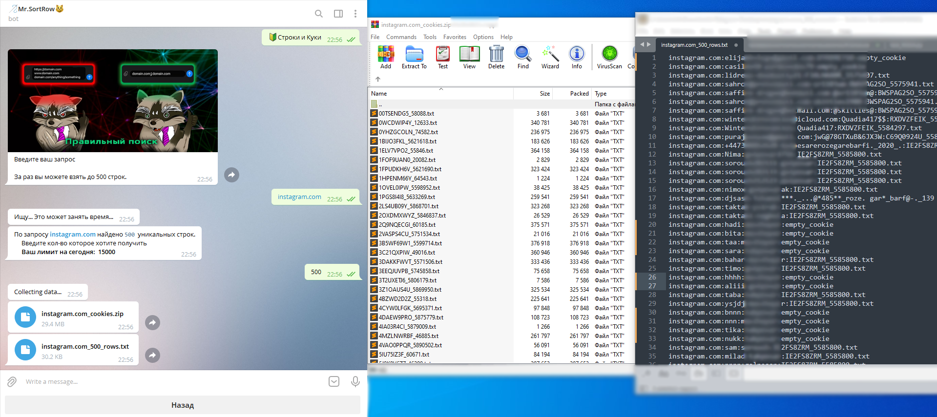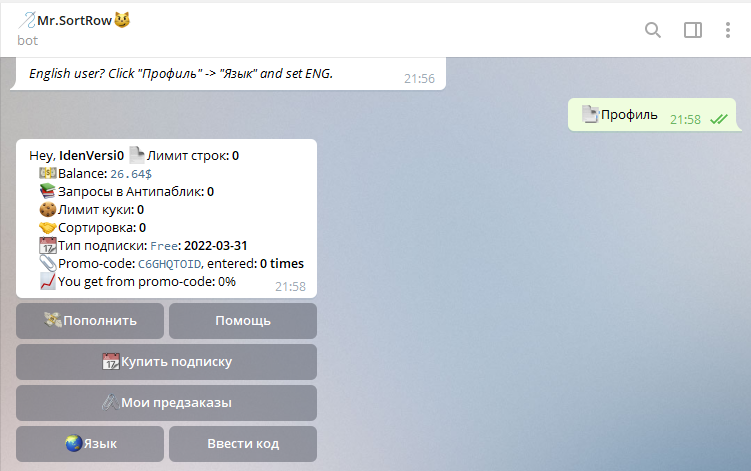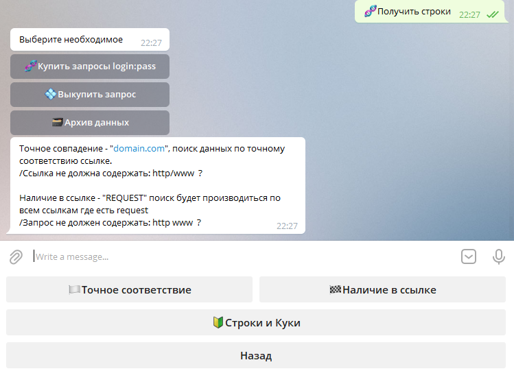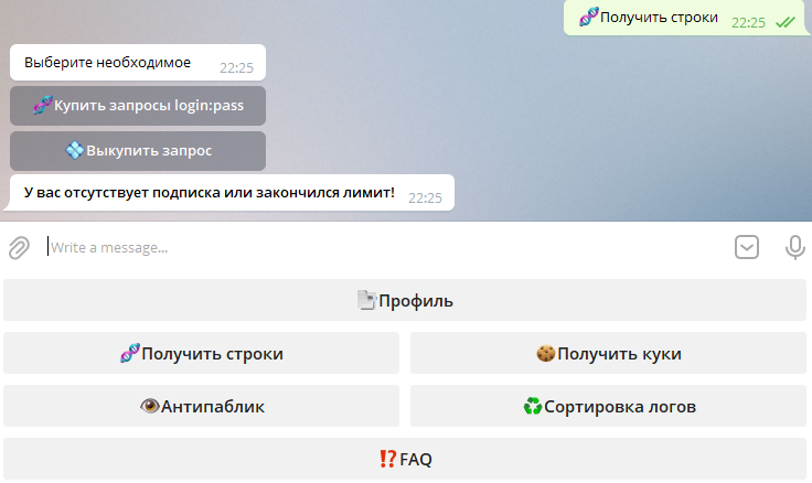 Чем является наш бот? Бот является облаком запросов, у нас продаются строки формата url:login:password, с недавнего времени в подписку введена функция Строки+куки с выдачей в формате url:login:password:cookie_filename