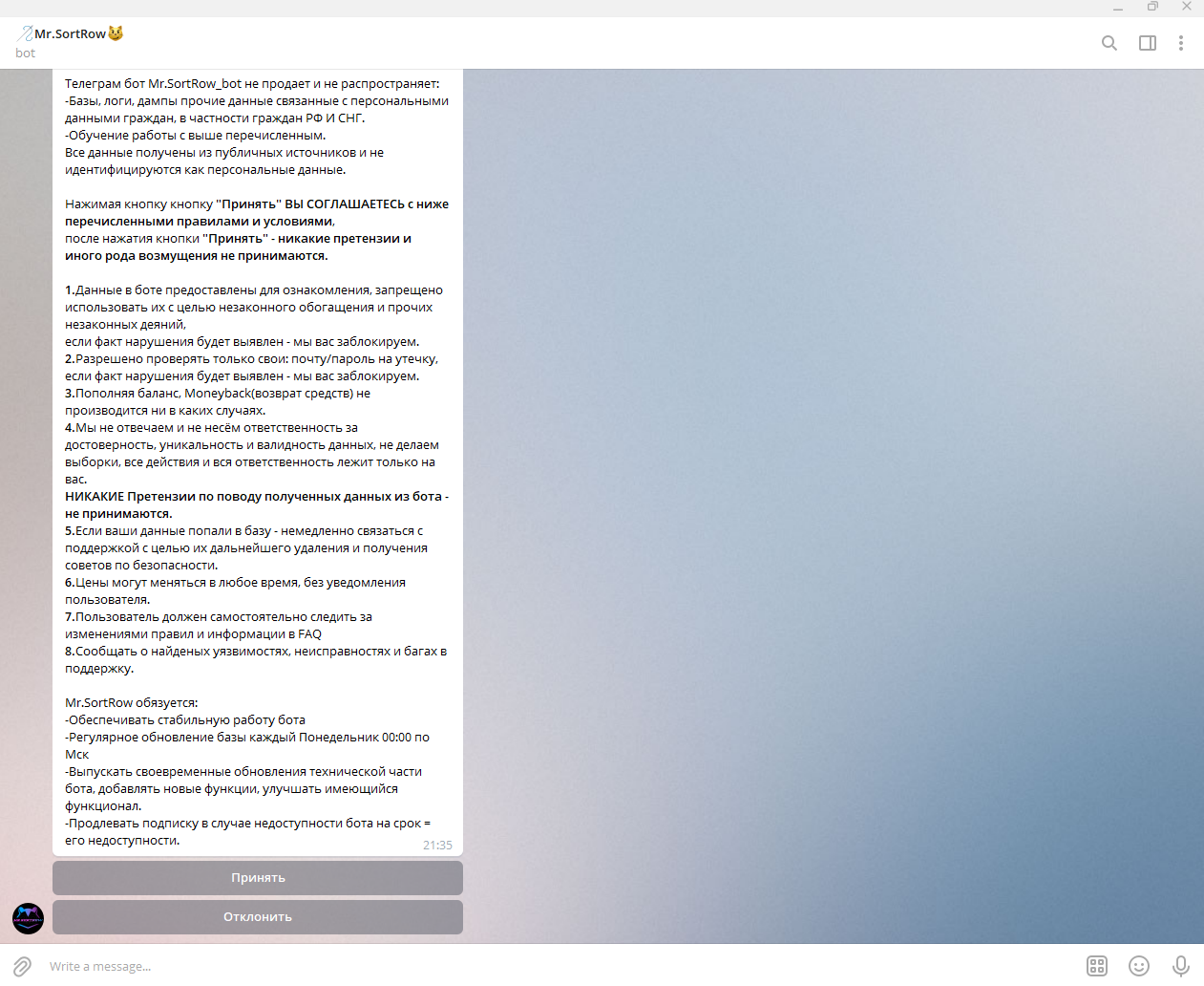 Отказавшись от которого, вы не сможете пользоваться ботом.