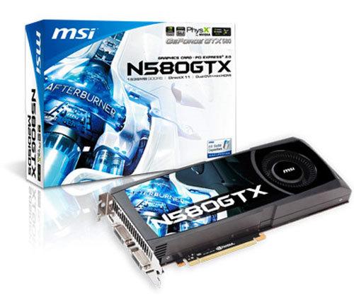 MSI GTX 580 Lightning Xtreme Edition . 832 MHz . 1050 MHz . 3 GB, 305 mm/12 inches, 2x DVI 1x HDMI 1x DisplayPort . MSI GTX 580 OC . 823 MHz . 1069 MHz . 268 mm/10 .6 inches, 2x DVI 1x HDMI 1x DisplayPort .