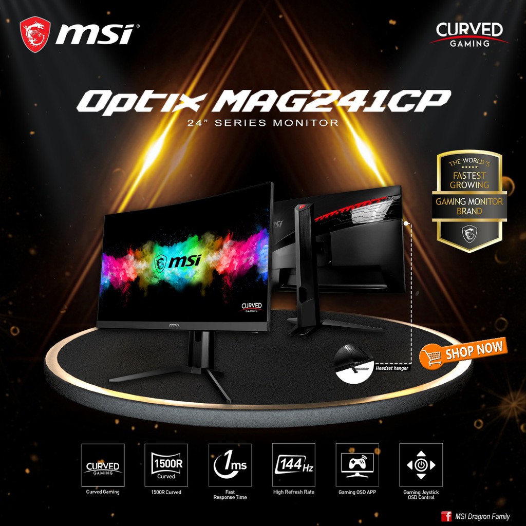 Visualize your victory with the MSI Optix MAG241CP curved gaming monitor . Equipped with a 1920x1080, 144hz Refresh rate, 1ms response time panel, the Optix MAG241CP will give you the competitive edge you need to take down your opponents .