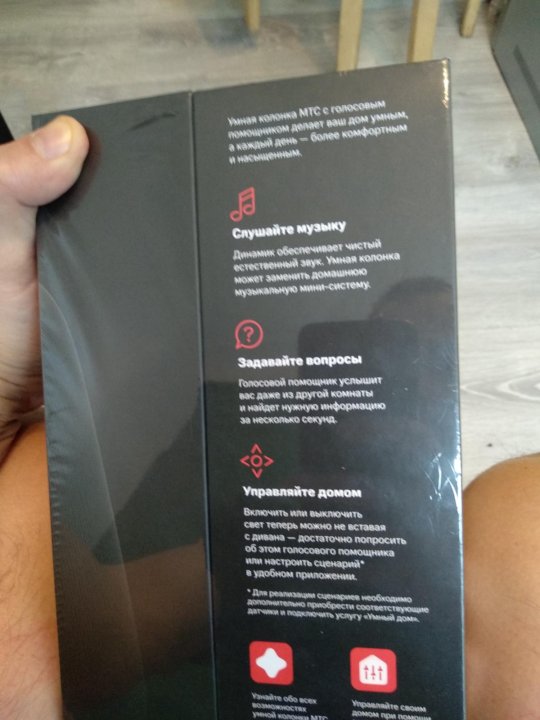 Колонка поставляется в прямоугольной коробке, выполненной в чёрно-красных тонах . Спереди логотип бренда МТС Home и надпись: «Умная колонка с голосовым помощником» .