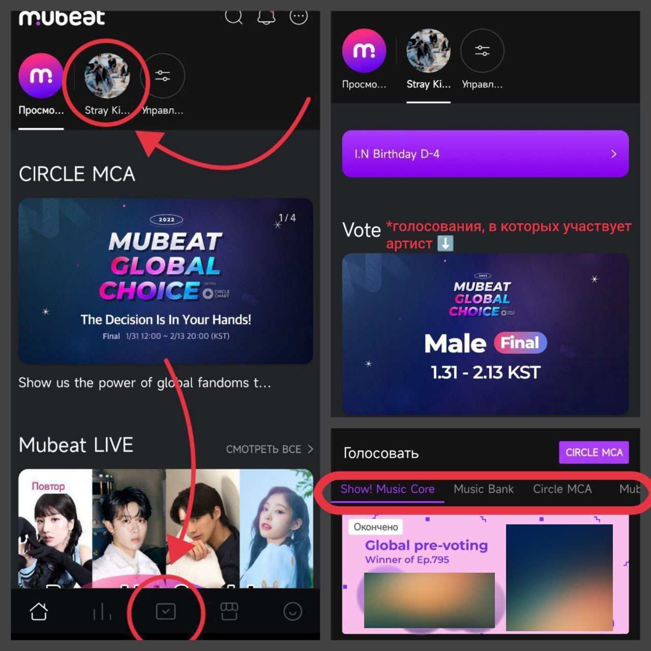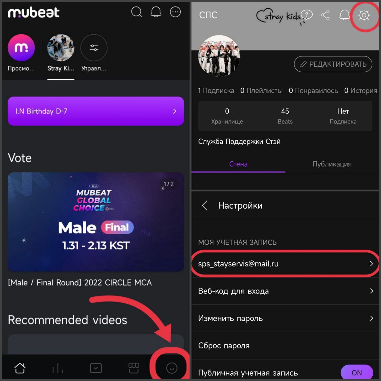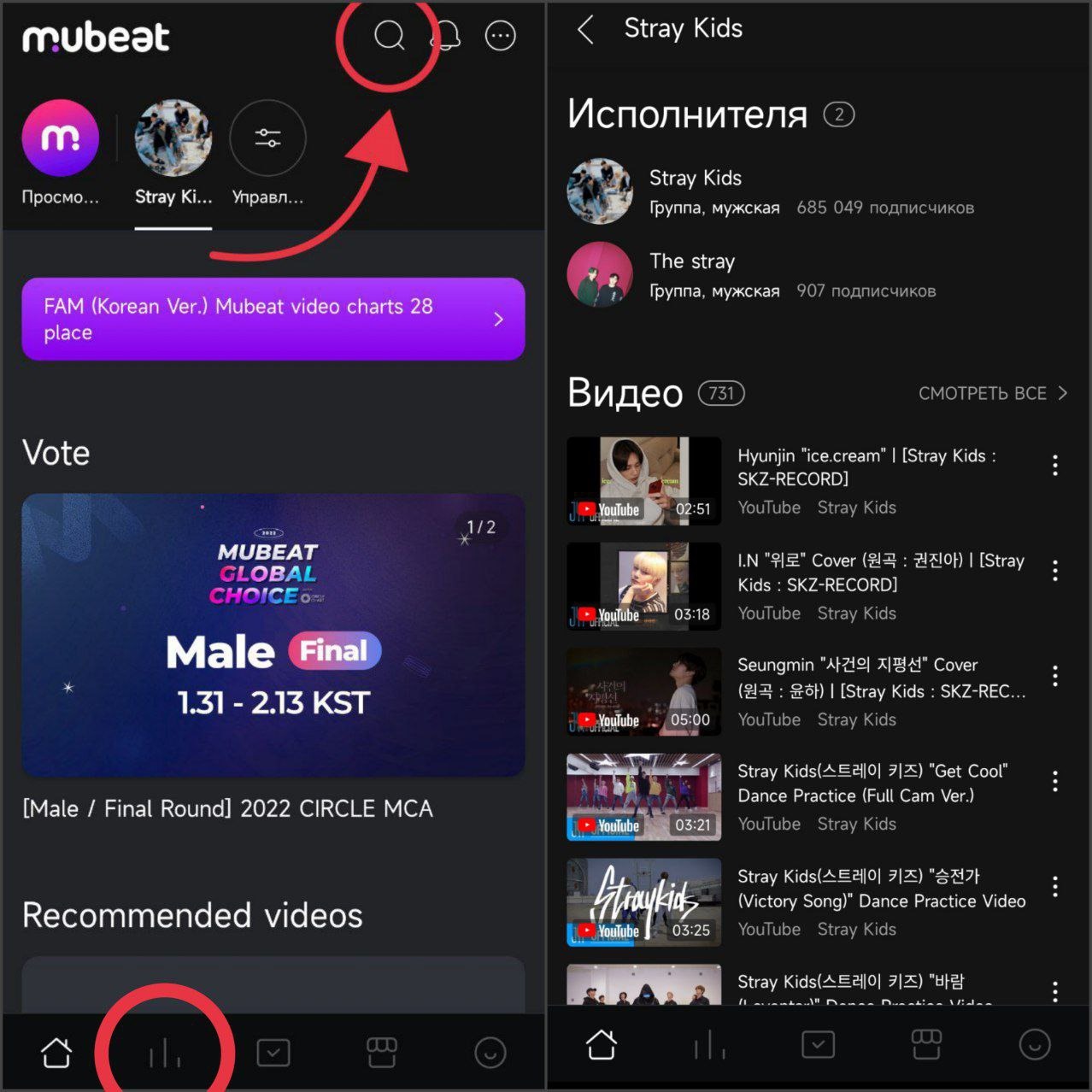 В Mubeat можно смотреть видео, что необходимо для недельного рейтинга видео шоу Music Core. Для этого в поиске вбиваем Stray Kids и смотрим нужное нам видео. Чарт видео можно посмотреть во второй слева вкладке на нижней панели.