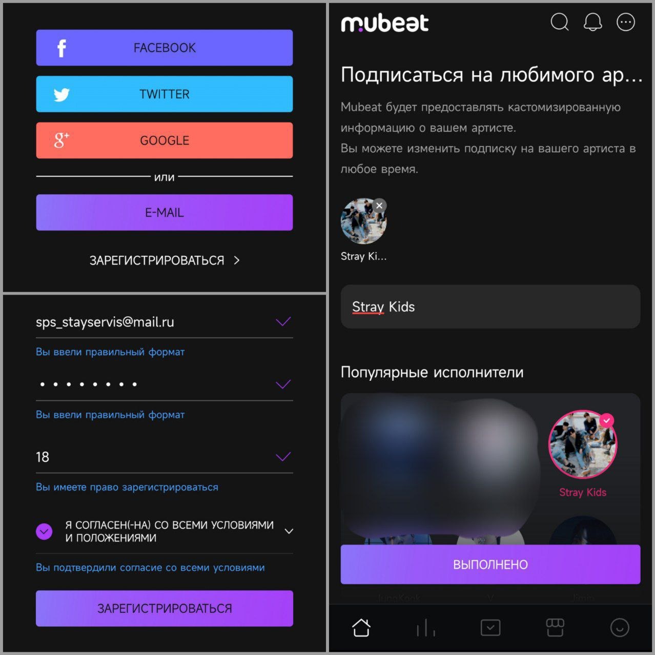 После выбора способа регистрации вводим возраст (16+) и соглашаемся со всеми условиями. Также не забудьте подписаться на Stray Kids.