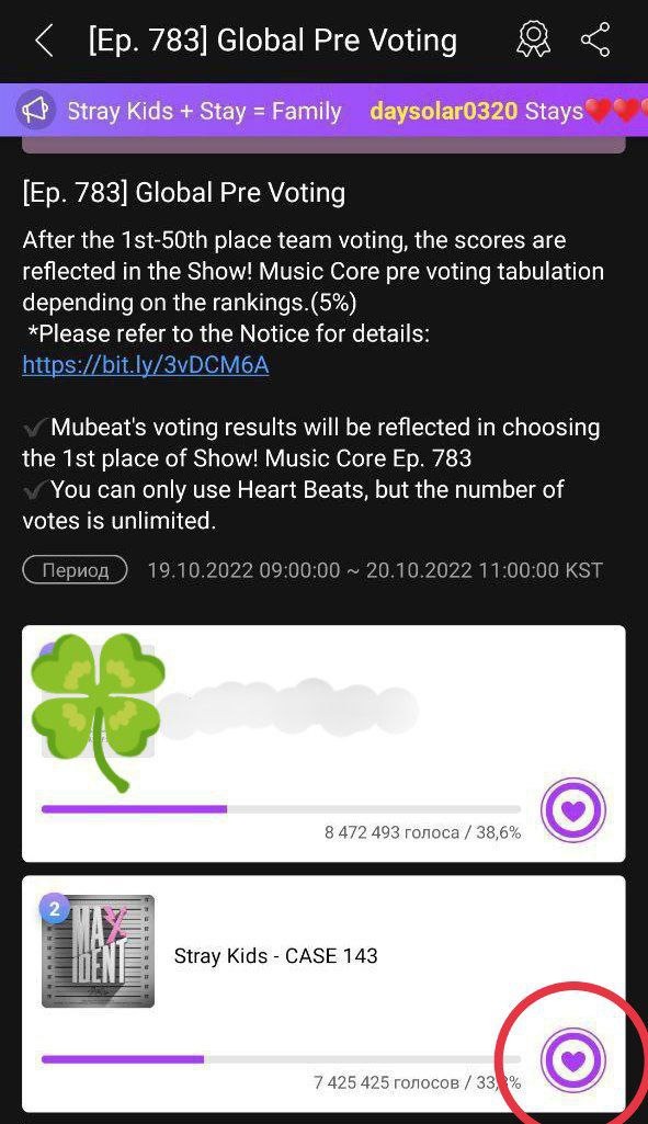 Для того чтобы проголосовать, кликаем на баннер с нужным нам голосованием, находим в списке участников Stray Kids и нажимаем на сердечко рядом с ними. Откроется окошко, где нужно ввести количество голосов, которое хотите отдать за артиста. Будьте внимательны(!): вводить надо число голосов, а не Heart Beats (1 голос = 3 Heart Beats).