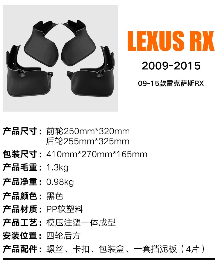 qSfnxvyPyVHere you can buy MudFlaps FOR Lexus RX 2009-2015 Car Splash Guards Fender Set Parts Front Rear Mud Flaps Automotive Accessories with free delivery to your post office.