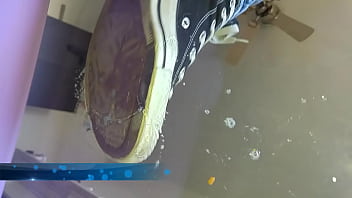 Loser humiliated with muddy shoes and feet . My white converse are way too clean for this loser - so I brought along a box filled with thick wet mud! I make my shoes dirty before stepping on the loser - and then use him as my human rug to clean them again . Of course he has to lick the dirt off my shoes as well before I take them off .