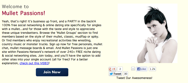Mullet Passions is a stand-alone free Mullet Lover Dating Site and if it isn't 100% clear yet, Mullet Passions has been designed specifically for the Mullet Lover community . Separately, it is also part of a much (much) larger network of niche dating sites .