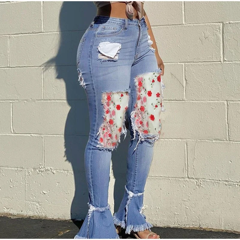 Multicolor Flower Embroidery Mesh Sheer Boho Patchwork Denim Joggers Women Spring Stretchy Ripped Skinny Flare Jeans Bell Bottom - Купить с бесплатной доставкой