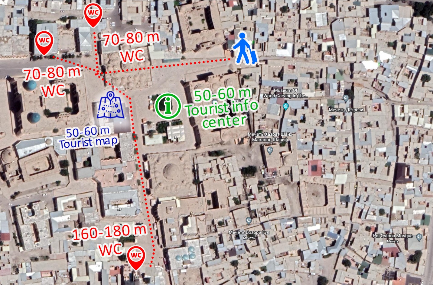 Шу жумладан, туркиялик сайёҳ юрган, Бухоро шаҳар Ҳақиқат кўчасида 2 та ҳожатхона бор. Бу эса сайёҳ юрган йўлдан 70-80 метр нарида дегани. Сайёҳ юрган йўлнинг чап тарафида йўл кўрсаткичлари ўрнатилган ва у ердаги ҳожатхона ҳам ишлаб турибди(тахминан 160-180м).