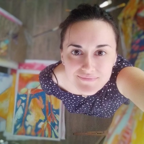 «Я народилася в Костянтинівці Донецької області, там же закінчила донецьку художню школу, а пізніше — Академію Дизайну та Мистецтв у Харкові. Я активістка й волонтерка. Я художниця й стріт-артерка, мандрівниця та любителька природи. Я жила та працювала у Китаї. У 2021-му отримала медаль «За внесок у розвиток культури і мистецтва» в Україні. Мала десять власних виставок та приймала участь у двадцяти п`яти колективних. Я працювала куратором більше ніж п`ятьох муралів в Україні. У картинах я наслідую традиції українського авангарду. Ці мурали та інші проекти були створені як дітьми, так і дорослими (біженцями й біженками, а також жертвами війни від 2014-го року на Донбасі).