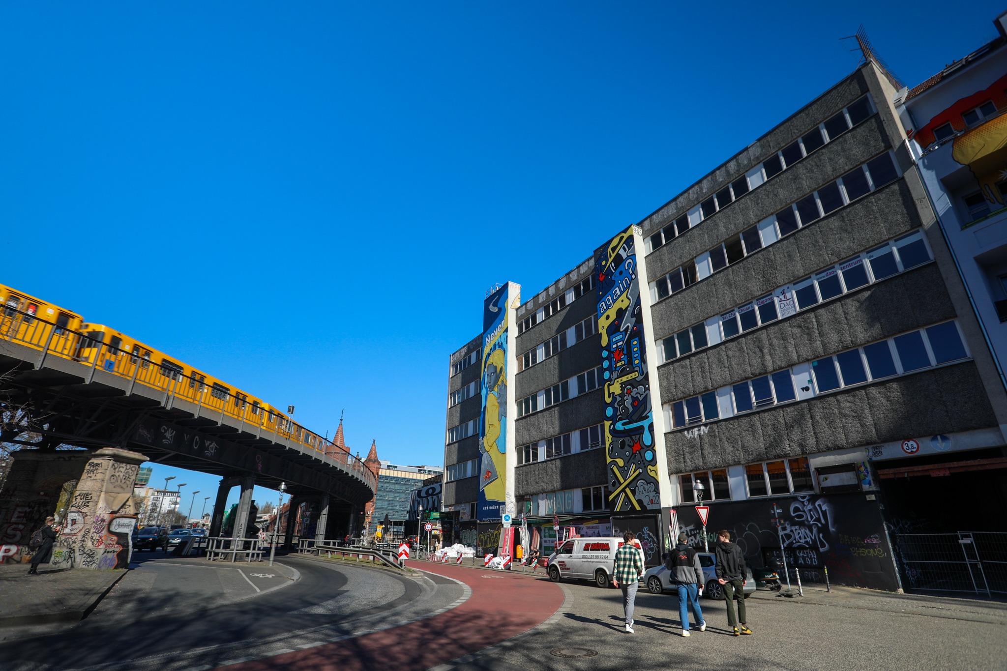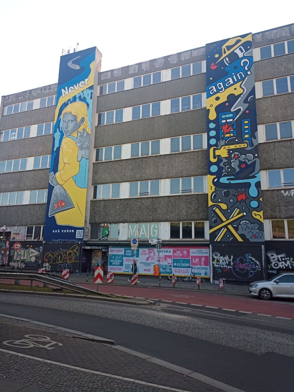 Від редакції. Наразі деякі колеги з нашої редакції, так само як і сотні тисяч українських громадян, були змушені евакуюватись із рідних міст. Куратор нашого редакторського відділу опинився в Берліні, де наразі офіційно вже перебуває понад 58 тисяч українок та українців. Тут Данило дізнався від знавчині стріт-арту та мисткині, дніпровчанки Марії Учитель про новий мурал, створений в столиці Німеччини нашими співвітчизницями-художницями та їхньою колегою з Білорусі. Мурал «Never again?» («Ніколи знову?») — величезна картина, вписана у міський простір на двох стінах на березі річки Шпрее навпроти легендарного Берлінського муру, символу несвободи та боротьби з нею. Він є частиною вуличного живопису, голосом народу, мистецькою реакцією на страхітливі події в нашій країні та ще одним способом розказати про них світові. Марія надала нам контакти художниць та інформацію про мурал із сайту проекту, що йому присвячений.