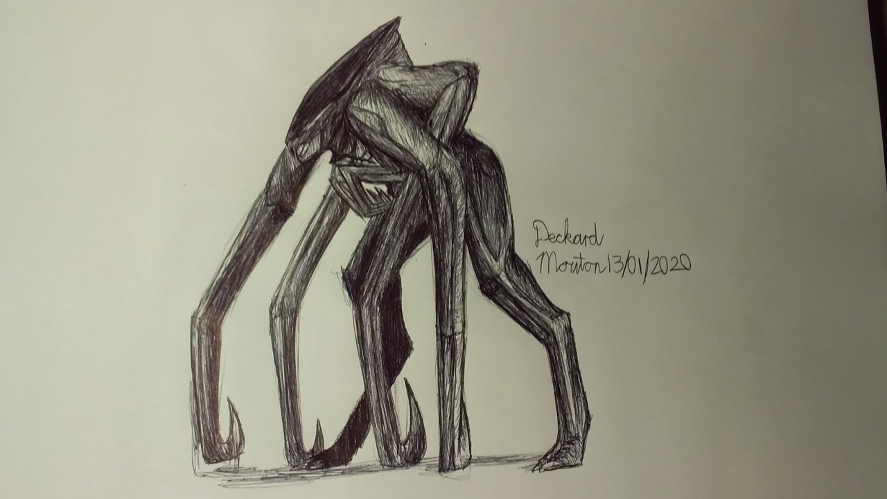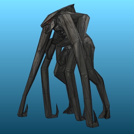 A grayish-black and white body with triangular jaws, one mandible in her chin, two pairs of forelimbs with a smaller pair on her chest, red visor-like eyes and hoofed hind legs.
