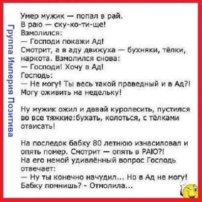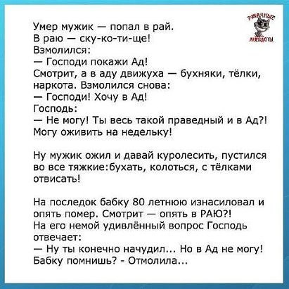 Анекдот от Alx 18 .11 .2021 в 05:16 . Умер мужик и попал в рай . В раю всё чинно, пристойно, тихо — скукотища! Взмолился: — Господи, покажи ад! Смотрит, а в аду движуха — бухло, телки, травка . . . Просит: — Господи! Хочу в ад!