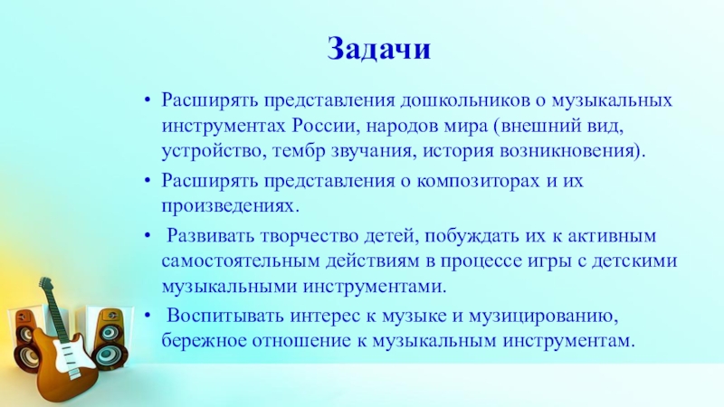 Сопровождающая презентация к конспекту "Музыкальные инструменты народов России", который также есть в моих документах . В ходе занятия дети познакомятся с музыкальными инструментами народов России .