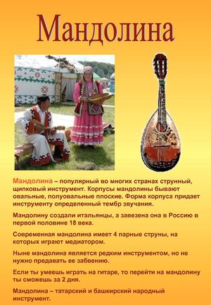 Курай - очень древний музыкальный инструмент . Первоначально, его использовали пастухи для передачи сигналов . Мандолина- старинный итальянский струнный инструмент . Мандолину любят во многих странах, а для татар она стала народным музыкальным . . .
