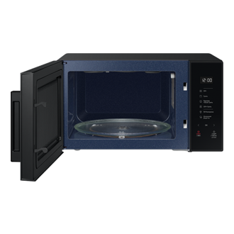Slide 1: Black Samsung Grill Microwave Oven with Healthy Grill Fry Function (MG23T5018CK/SM), 23L . Slide 2: front-open Black . Slide 3: front-open2-crustyplate Black . Slide 4: r-perspective Black . Slide 5: l-perspective Black . Slide 6: dynamic-cavity-with-grill- Black . Slide 7: detail-control-panel-and-handel Black .