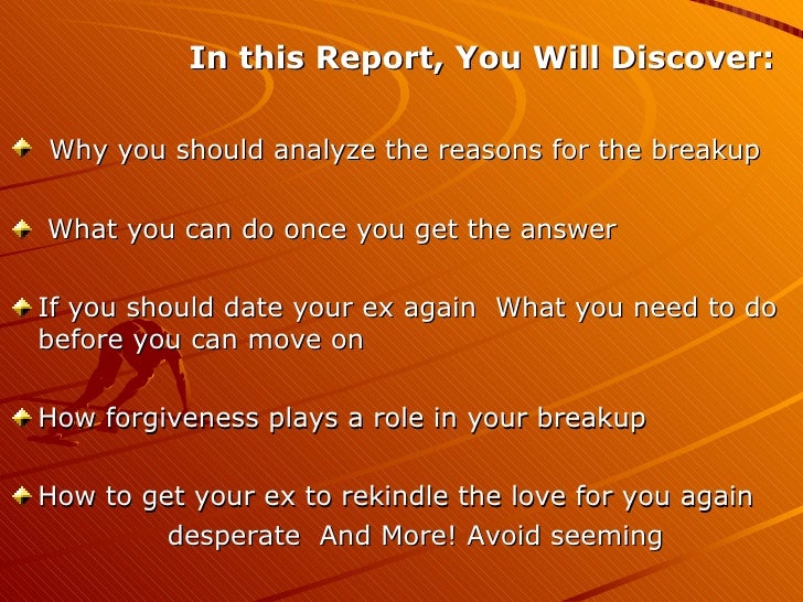 Whether you have left the family, or the partner has left you, it is equally important to see the situation as if from the outside, before asking yourself: "Should I get back with my ex - husband / ex -wife?" For instance, the partner dumped you, leaving you with the children . Conscience is bothering him or her . He/she misses their children, feels like a traitor . Also, your ex -spouse may be afraid that something bad will happen to you by his/her fault, or worry that you will shame him before . . .