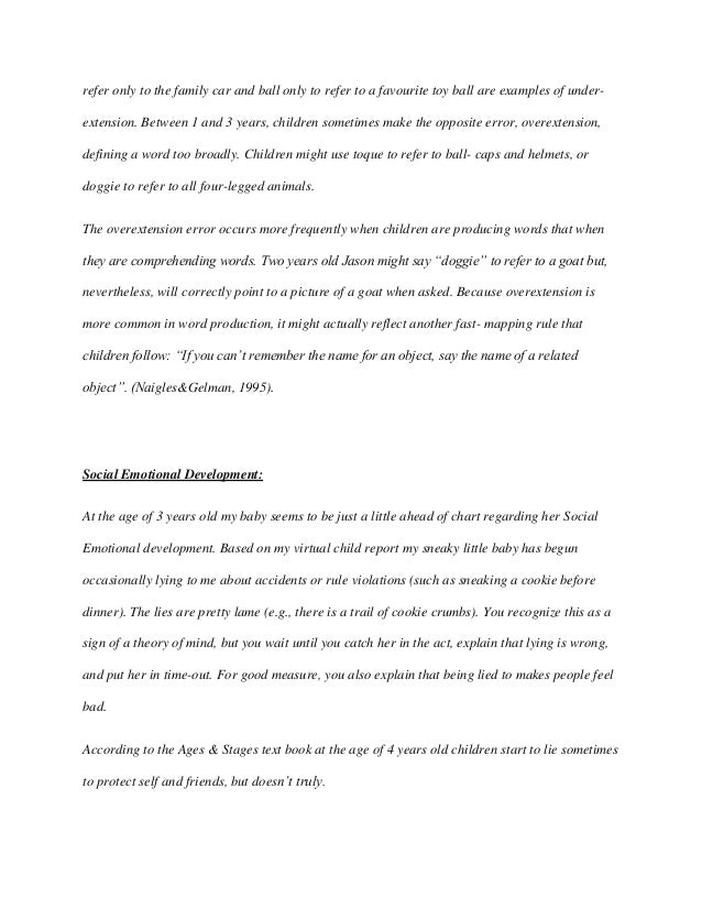 Submitted By drasticcoition . Words 1173 . Pages 5 . My Virtual Child Paper . My virtual child covers physical, social, emotional, and cognitive development at several age levels . This gave me an opportunity to visualize "the whole child " at various points in development . I raised a virtual child from birth to 18 years of age .