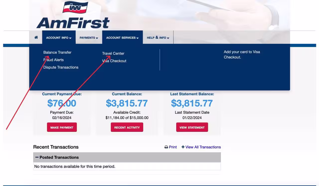 This is the main page of banks on this platform, here you can see the current balance (available credit) and spent balance (current) as well as see the history of past transactions (posted), and the history of the last transaction (pending).