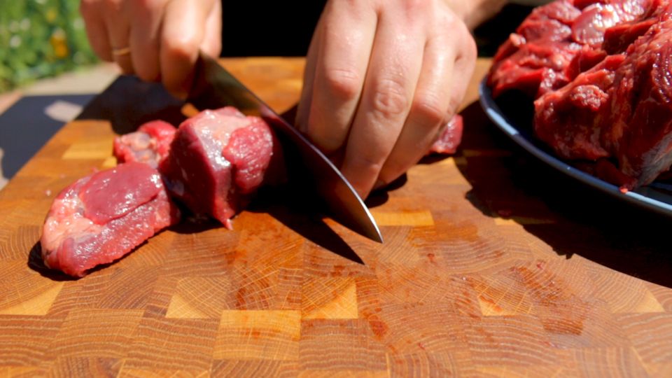 Невероятно вкусное мясо в казане на костре! Свинина с овощами с запахом дымка- это прекрасный вариант горячего для разнообразия вашего меню . . . . как на фото . Шаг 4: Мясо разделать на кусочки . . .
