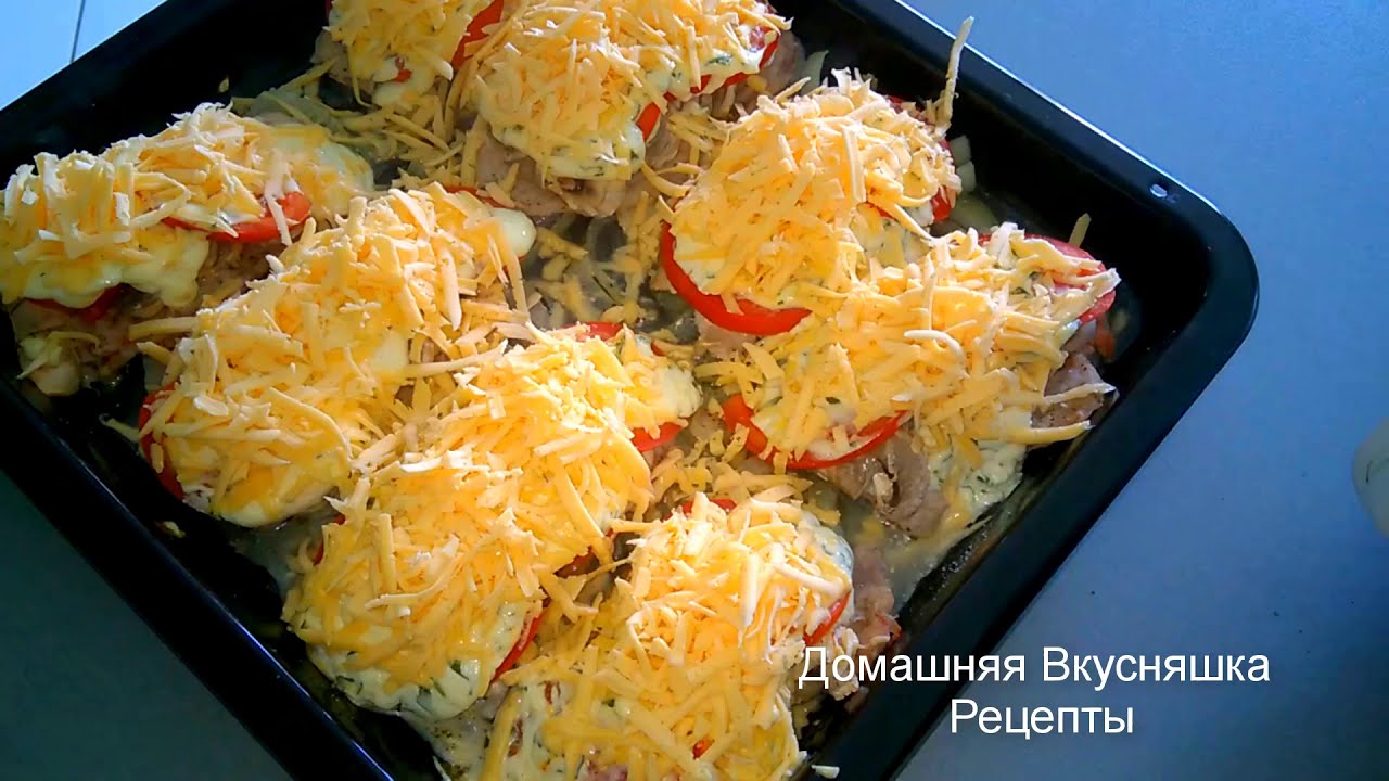 1 . Мясо промойте, нарежьте на порционные кусочки, слегка отбейте и поперчите . 2 . Помидоры помойте и нарежьте тонкими кружочками, сыр-кубиками, оливки - колечками . 3 . Форму для выпекания смажьте . . .