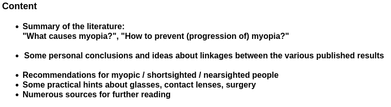 Additionally, some practical hints about various subjects, which are related to myopia are included, as well as resulting overall recommendations.