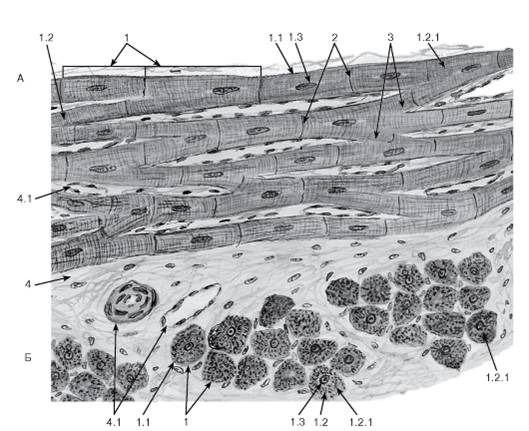 1 - кардиомиоциты (образуют сердечные мышечные волокна): 1.1 - сарколемма, 1.2 - саркоплазма, 1.2.1 - миофибриллы, 1.3 - ядро; 2 - вставочные диски; 3 - анастомозы между волокнами; 4 - рыхлая волокнистая соединительная ткань: 4.1 - кровеносные сосуды